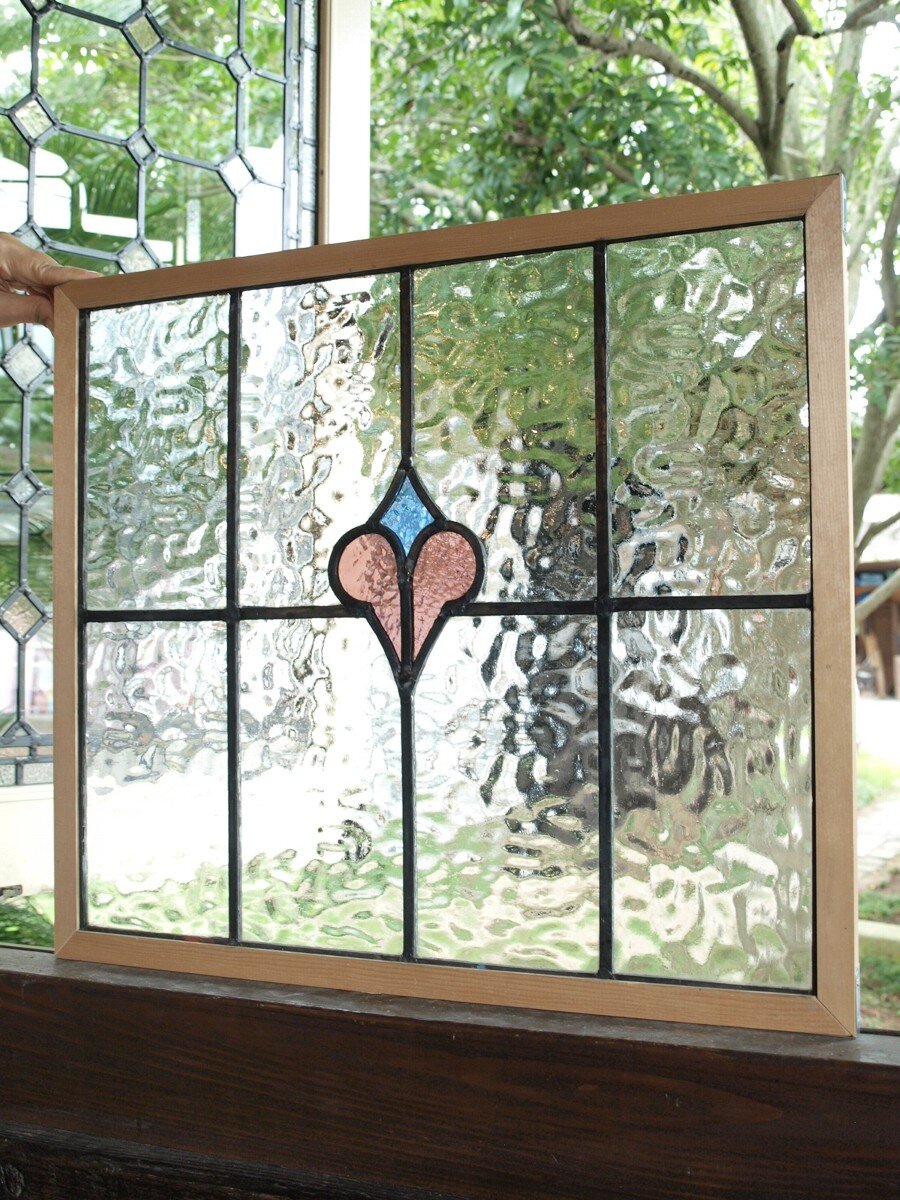 ガラスのシワや気泡、経年による細かな表面キズ、薄いガラスの剥がれ(チップ)、ケーム(鉛線)の色落ち、木枠の欠けや塗装の剥げ等については、アンティークならではの味わいとして現状のまま販売しておりますので、予めご了承ください。