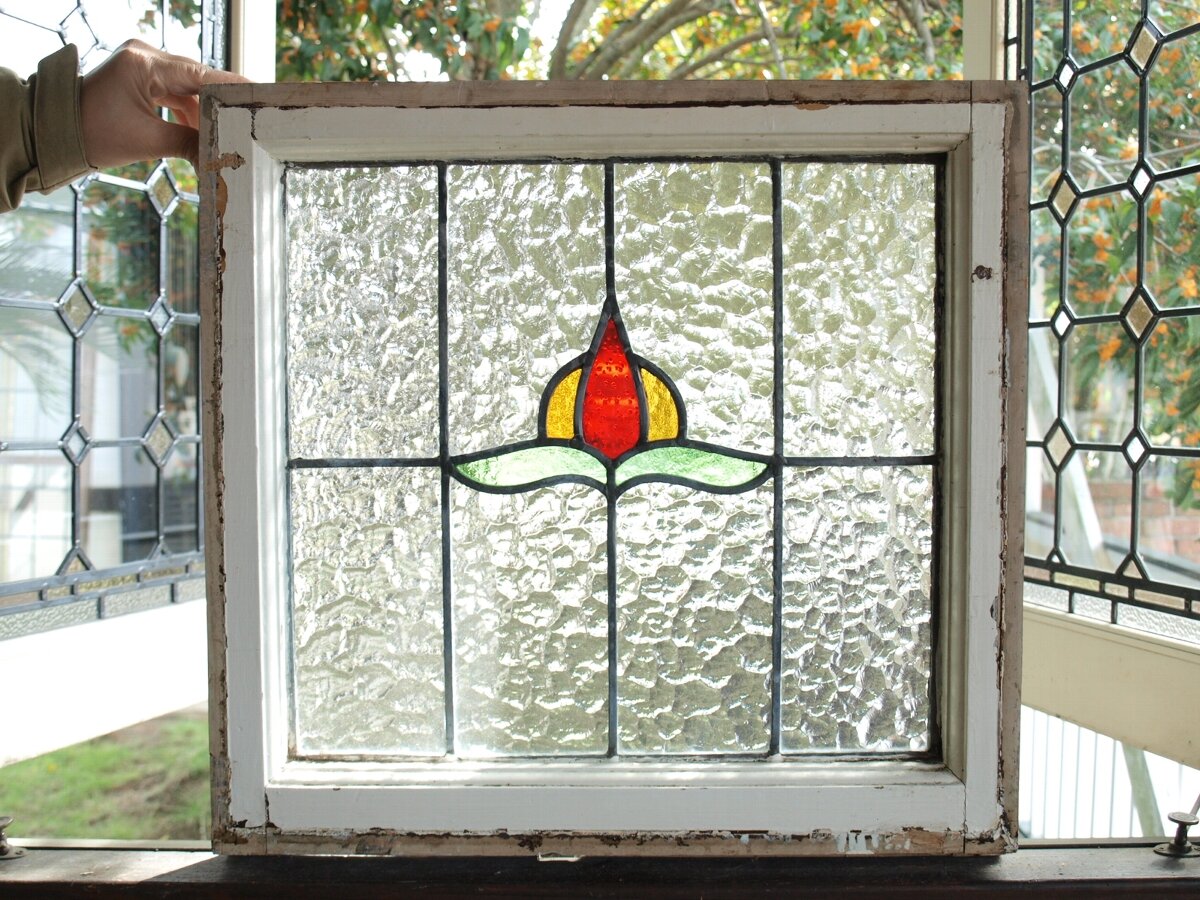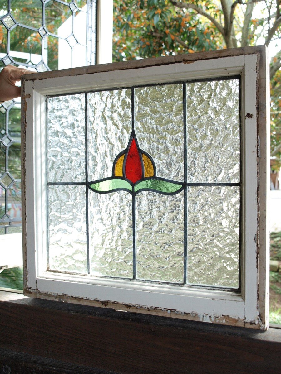 ガラスのシワや気泡、経年による細かな表面キズ、薄いガラスの剥がれ(チップ)、ケーム(鉛線)の色落ち、木枠の欠けや塗装の剥げ等については、アンティークならではの味わいとして現状のまま販売しておりますので、予めご了承ください。
