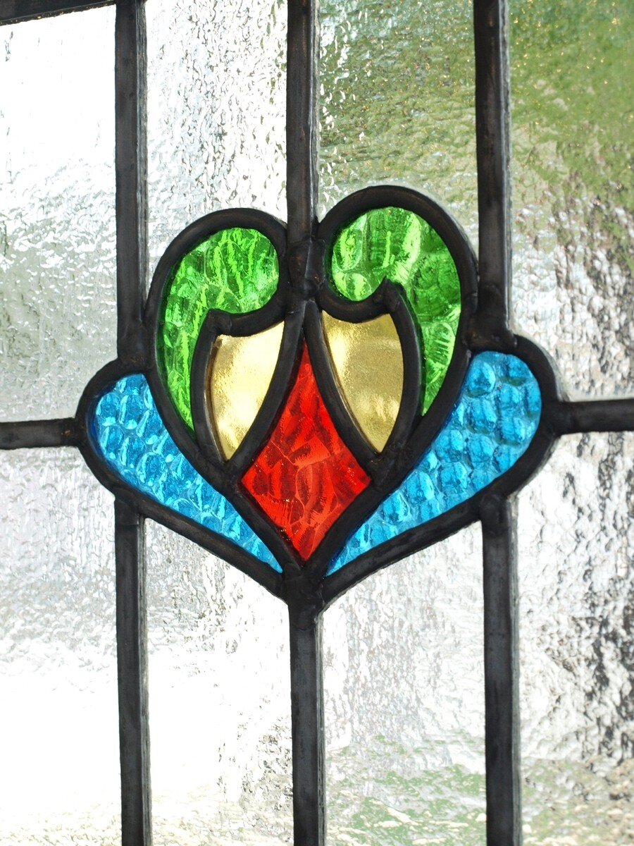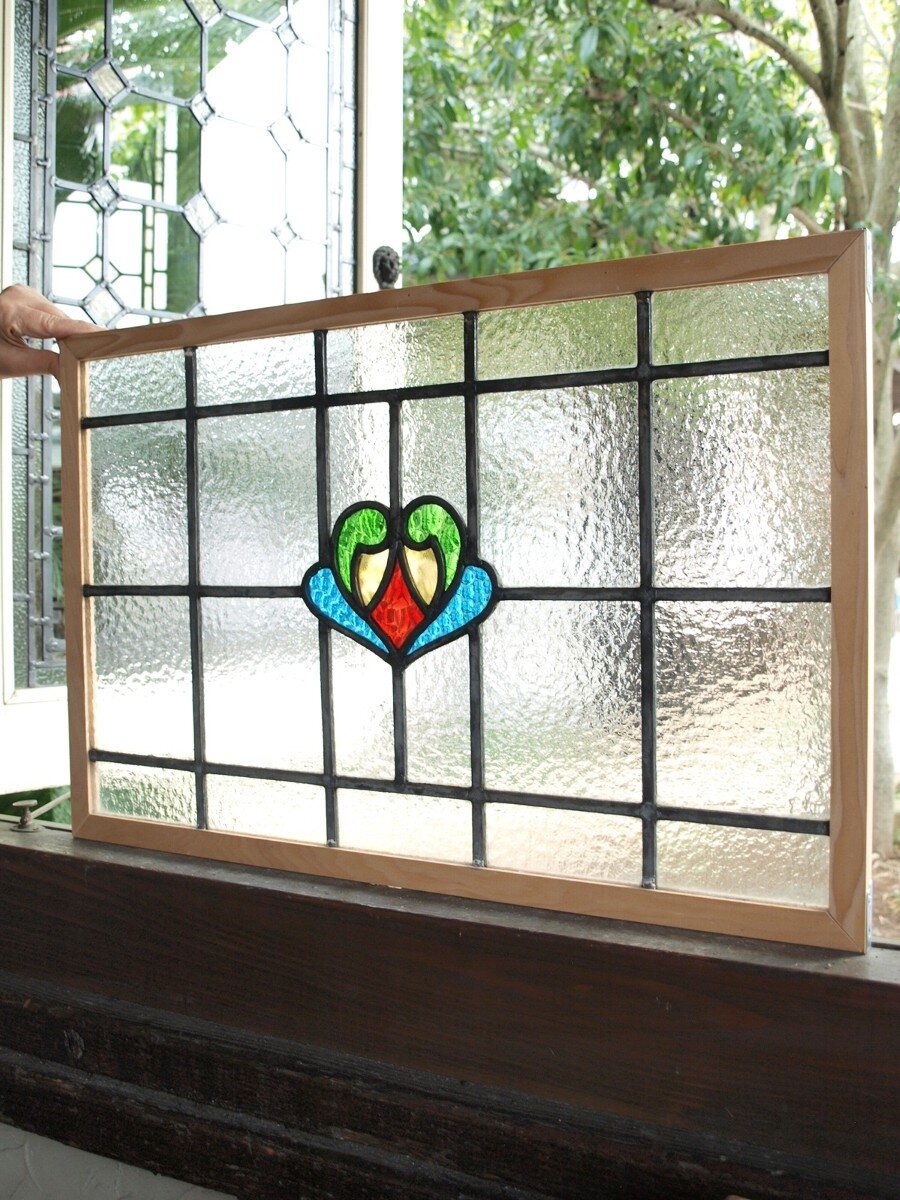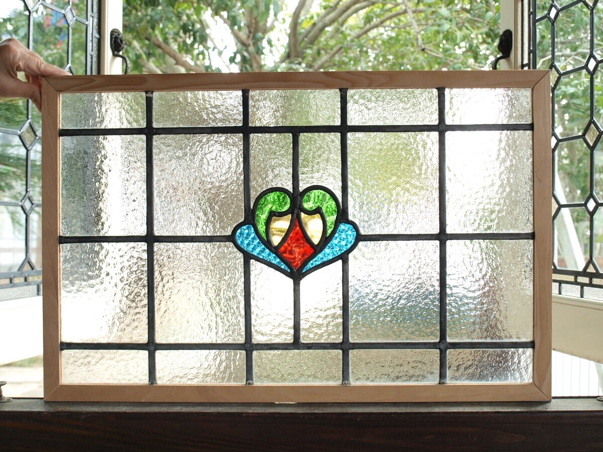 ガラスのシワや気泡、経年による細かな表面キズ、薄いガラスの剥がれ(チップ)、ケーム(鉛線)の色落ち、木枠の欠けや塗装の剥げ等については、アンティークならではの味わいとして現状のまま販売しておりますので、予めご了承ください。