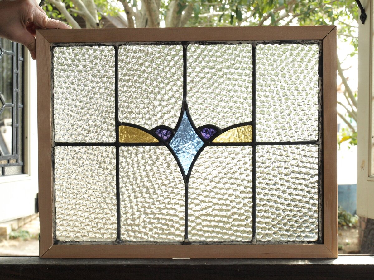 ガラスのシワや気泡、経年による細かな表面キズ、薄いガラスの剥がれ(チップ)、ケーム(鉛線)の色落ち、木枠の欠けや塗装の剥げ等については、アンティークならではの味わいとして現状のまま販売しておりますので、予めご了承ください。