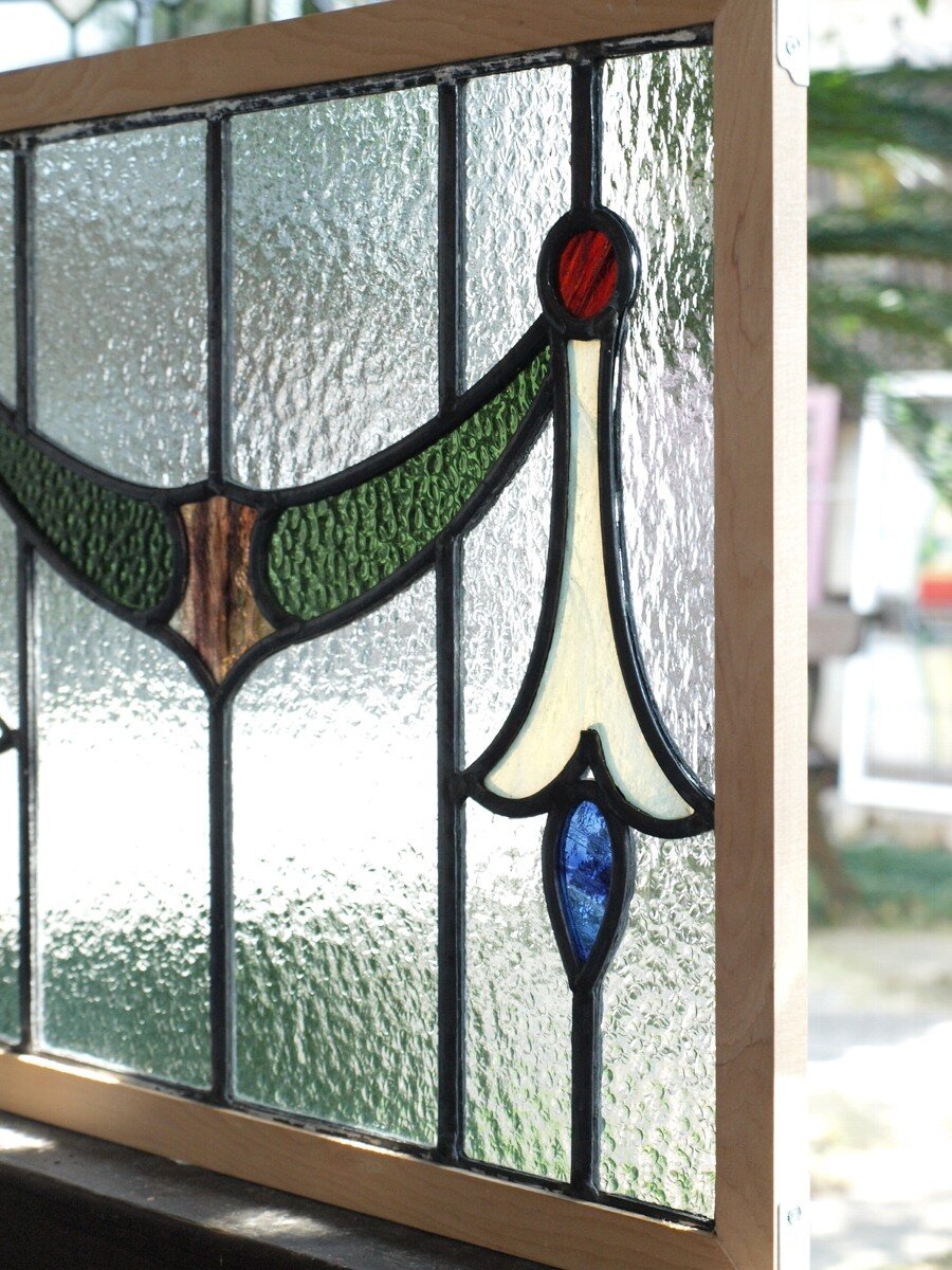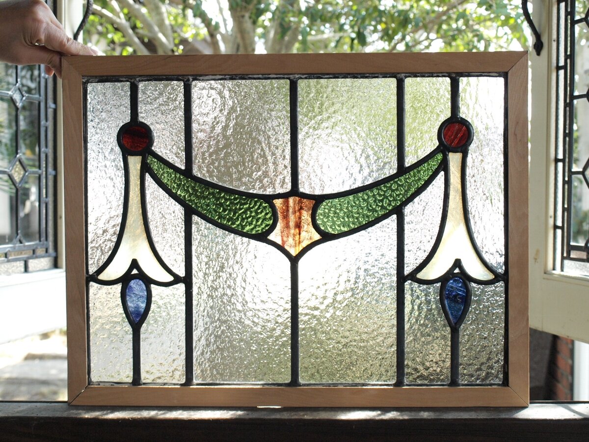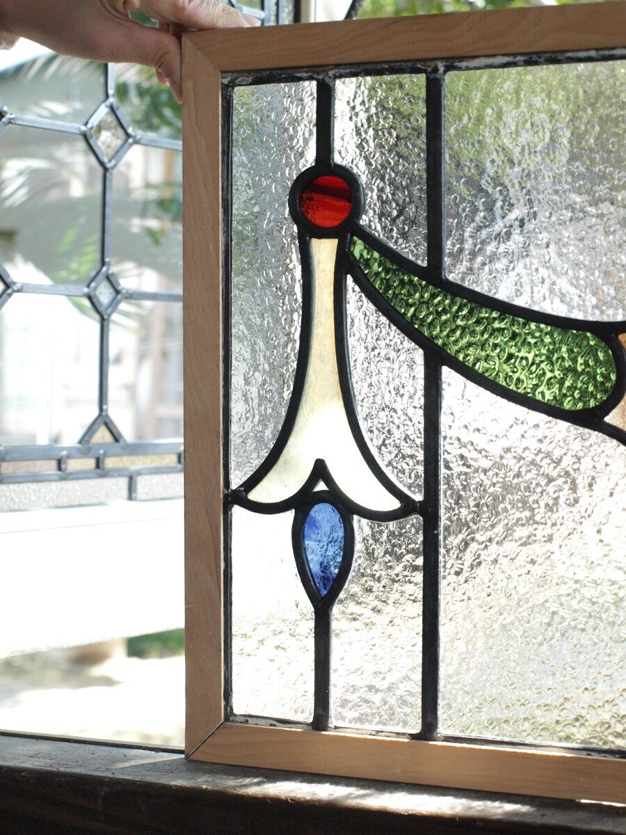ガラスのシワや気泡、経年による細かな表面キズ、薄いガラスの剥がれ(チップ)、ケーム(鉛線)の色落ち、木枠の欠けや塗装の剥げ等については、アンティークならではの味わいとして現状のまま販売しておりますので、予めご了承ください。