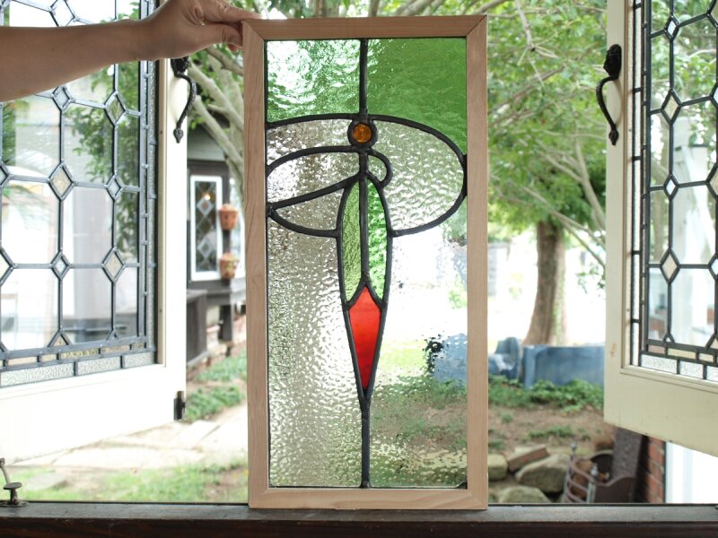 ステンドグラスを玄関上の半円窓に収まるように加工しました。玄関の照明がステンドグラスを照らしています。
