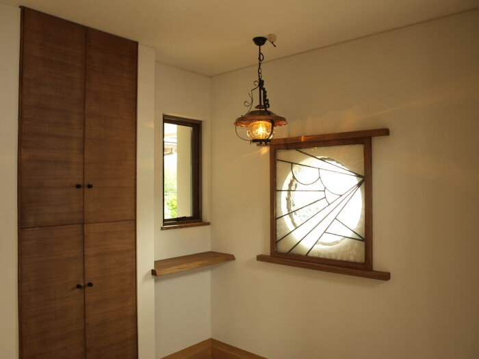 岡山市のM邸です。ステンドグラスの光と照明の灯りが織りなす、居心地の良いマイホームが完成しました。