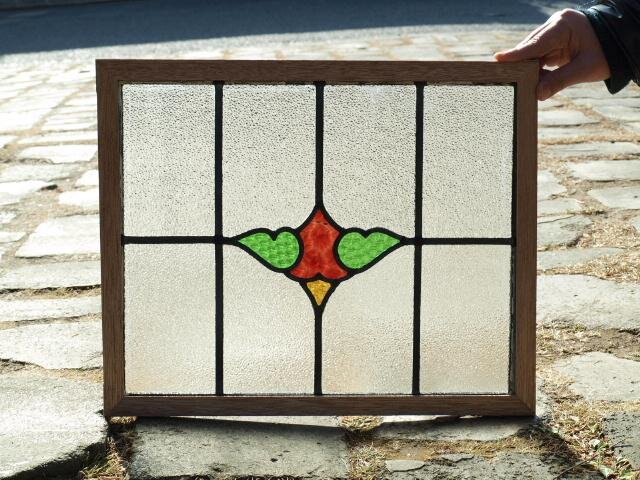 元のアンティークステンドグラスです。アンティーク木枠のまま窓辺に立て掛けて飾りました。