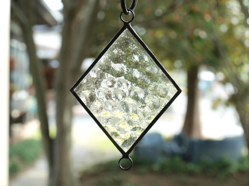 元のアンティークステンドグラスです。屋外に面した壁に窓として取り付けました。緑一面の田園越しに、緩やかな曲線のステンドグラスが一幅の絵のように。