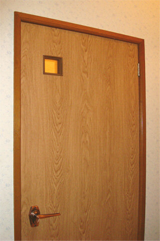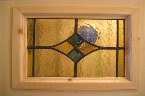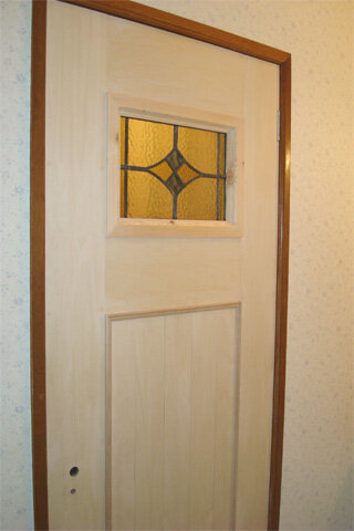 既存のドアをそのまま活用してリフォームされたとのこと!ステンド用の穴を開け、周りにはベニヤ板を貼ったそうです。ステンドは上下のガラスをカットして横長に加工しました。