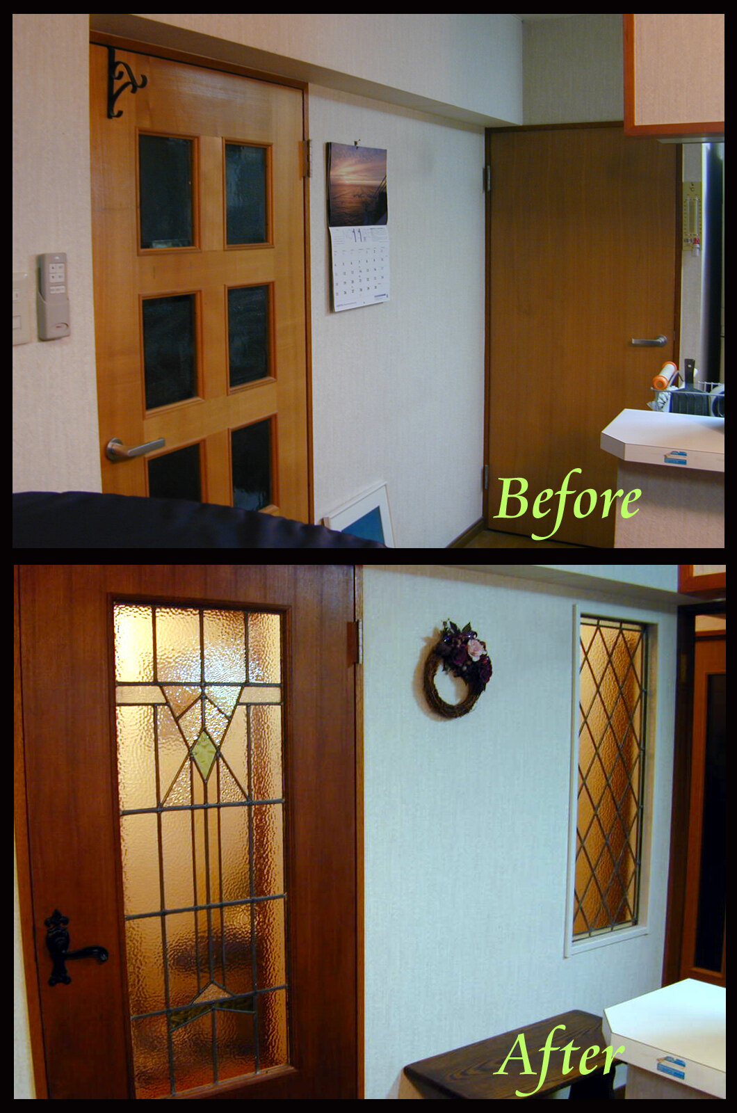 昨年購入させていただきました2枚のステンドグラスをやっと施工することができました。before/afterの画像を添付させていただきました。大変満足のゆくリフォームができました。マンションの部屋は、壁構造、ということもあるのかもしれませんが、やたらと閉鎖的な箱ばかりが繋がっている印象があります。今回ドアを思い切って1枚撤去し代わりに壁に穴をあけてステンドグラスをはめ込んだことで玄関とキッチンの両方から採光ができるようになり、暗かった廊下にも開放感が出て柔らかな光に包まれたとても雰囲気のある空間になりました。これも、貴社がウェブサイトで色々な施工事例を紹介してくださったおかげです。心より感謝しております。