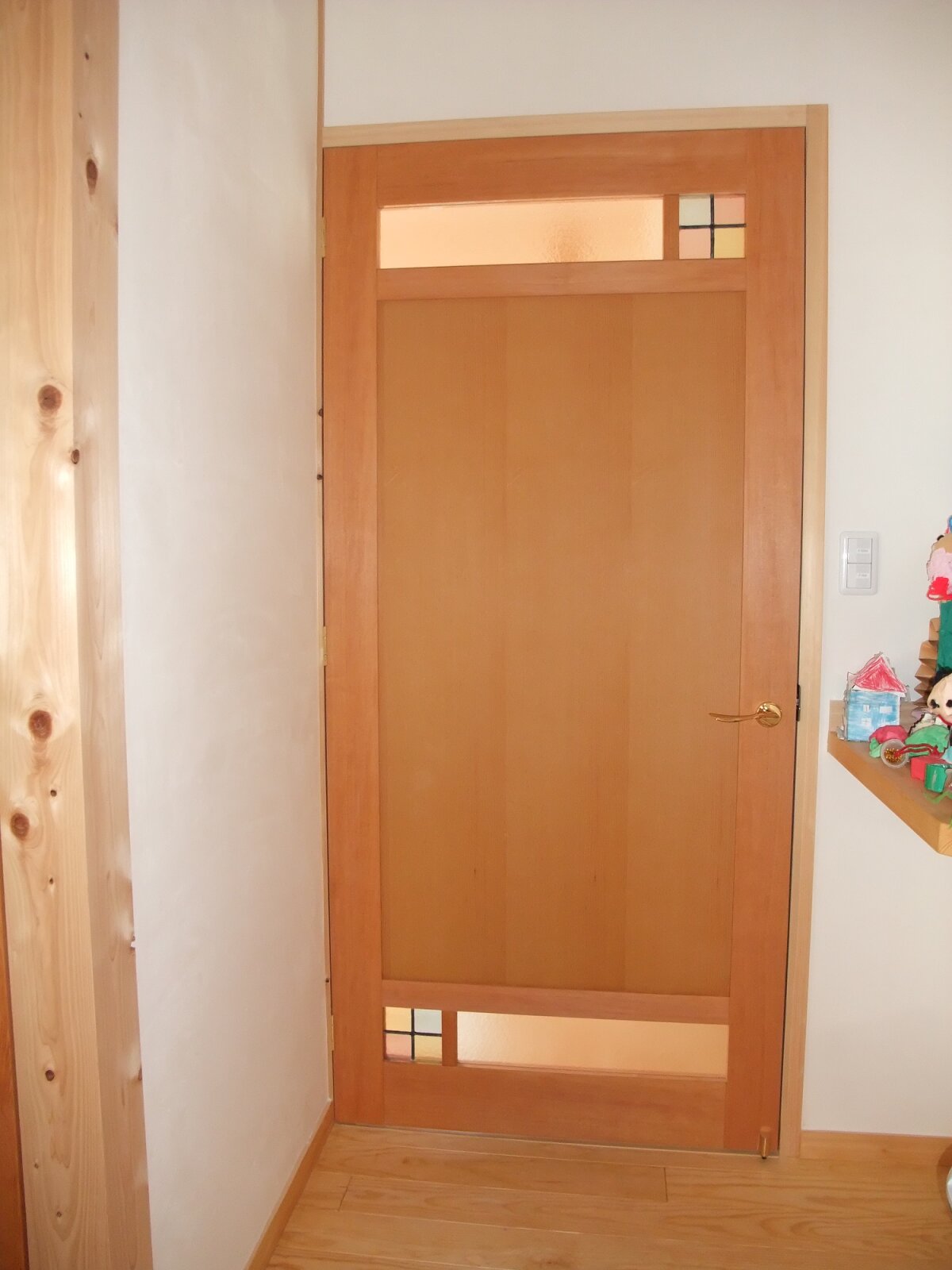 1枚のステンドグラスを12個にバラしていただきお世話になりました。おかげさまで、建具の玄関ドアや室内ドアにデザインされた型板ガラスの代わりに、上手くはめ込むことができました。 添付の写真は、玄関とリビングを仕切るドアになり、上下に1枚ずつ埋め込んでいます。機会がありましたら、またお邪魔したいと思います。