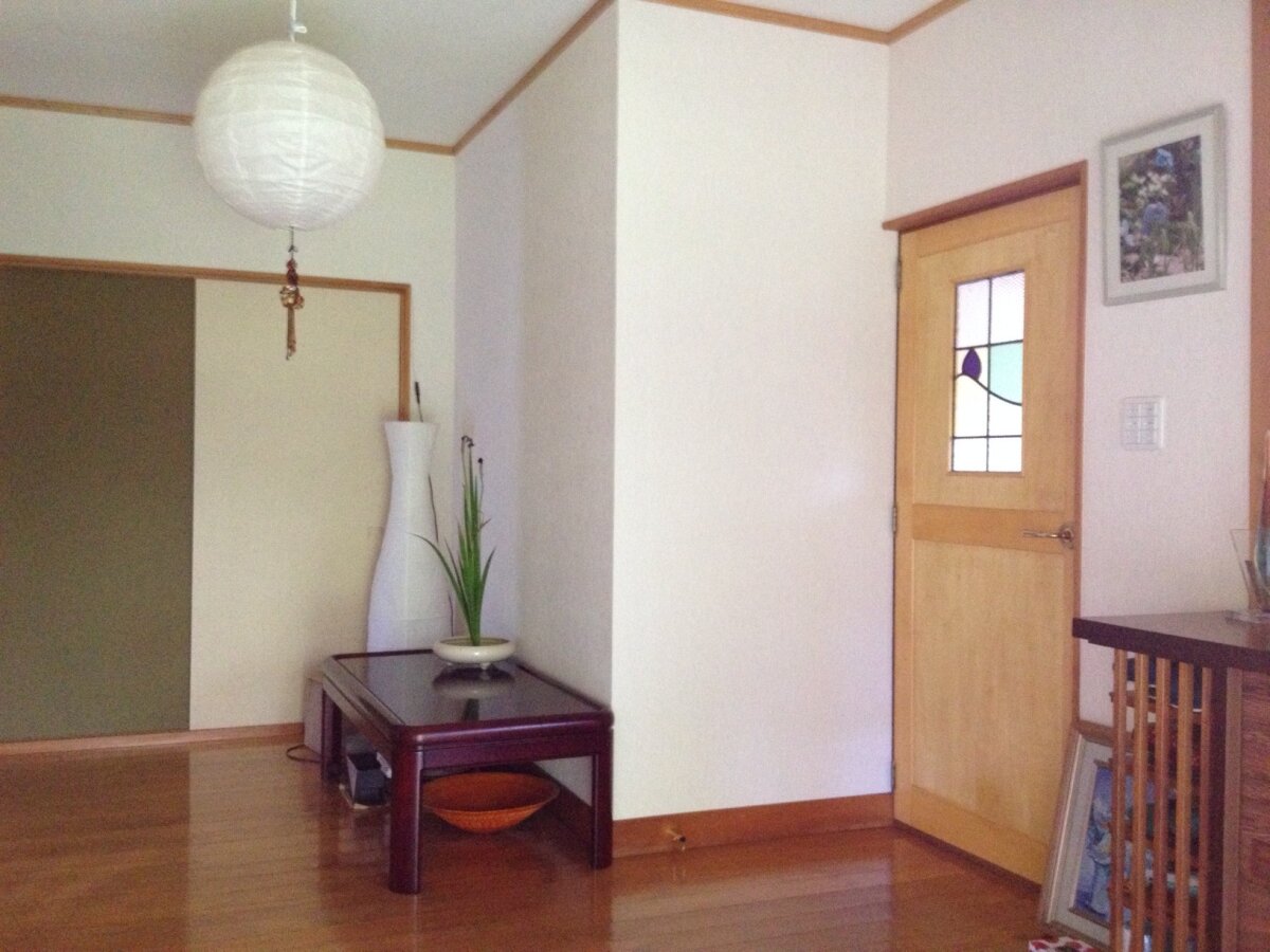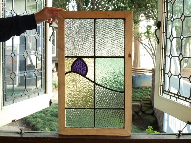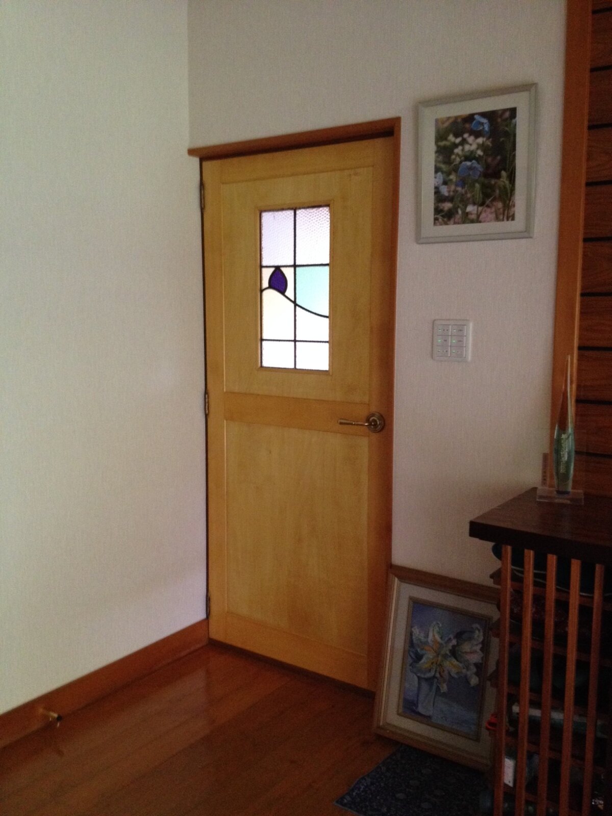 和洋折衷の玄関ですが生け花ともぶつからず、大工さんが造った立派なドアに粋に入っていました。このステンドグラスが1910年代のイギリス生まれとは…。デザインがちょっとベタ塗り的でジャポニカっぽく斬新です。このつぼみみたいなのが群青色に見えますが、実際は紫色で母はこの色で良かったと喜んでいました。本当にありがとうございました。ポートベロさんのアンティークステンドグラスはセンスが良く、他のお店の見てもやっぱり戻ってきてしまいます。