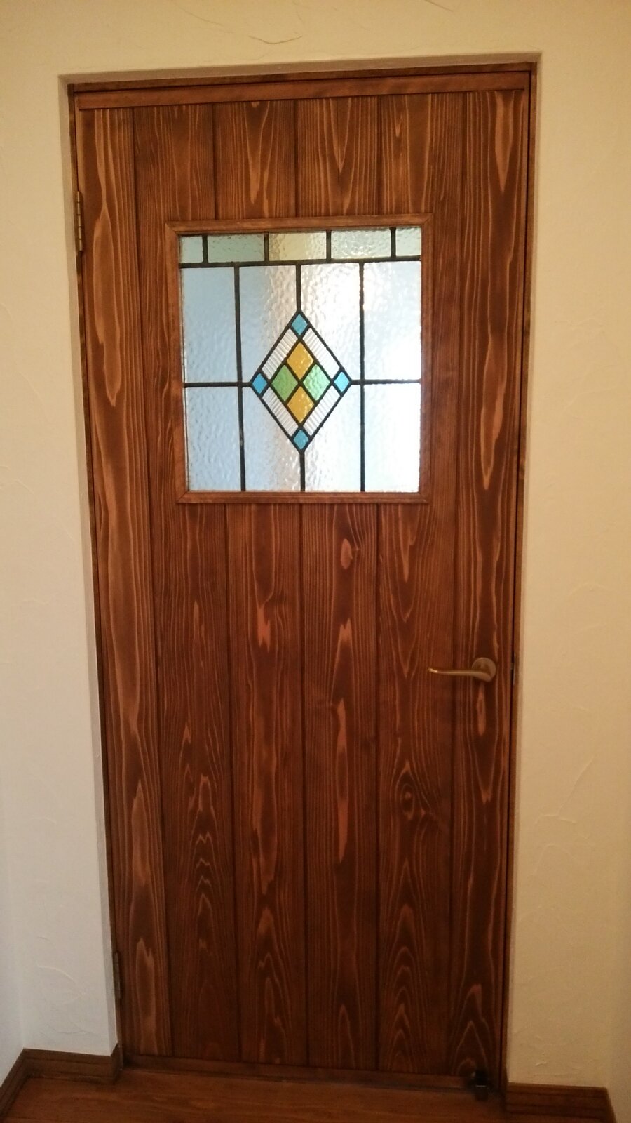 元のアンティークステンドグラスです。ドアにはめ込みました。シンプルでさわやかな色合いのステンドグラスが、こげ茶色の建具に美しく映えます。