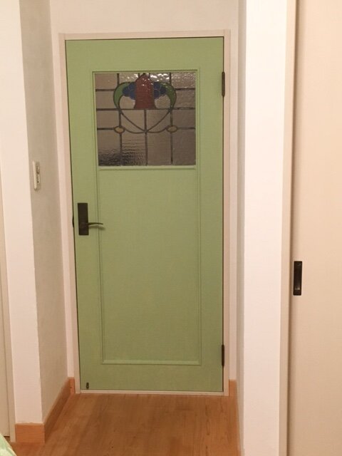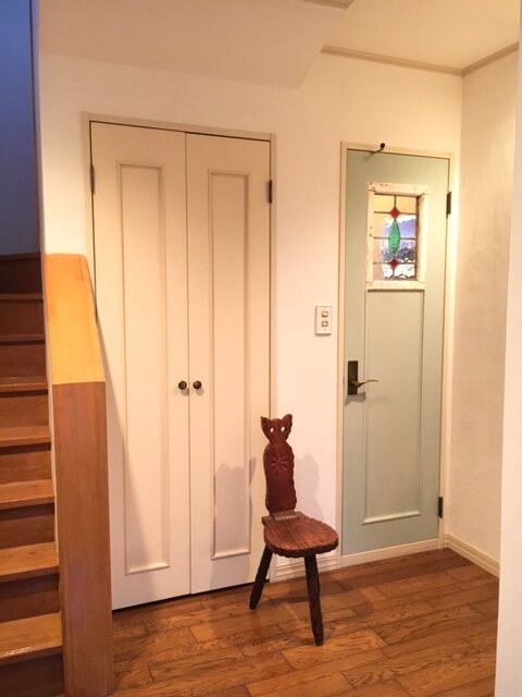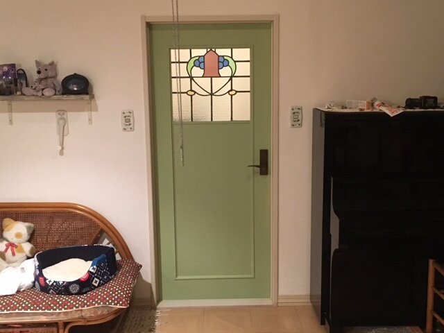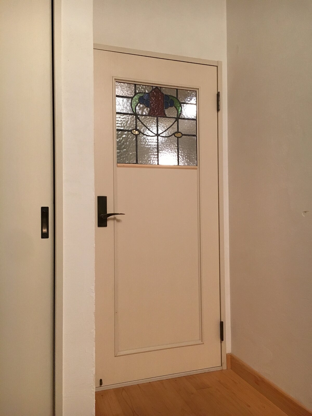 もうひとつのお部屋のドアにも、少し大きめのステンドグラスを。こちらも、お客様ご自身のDIYによるもの。