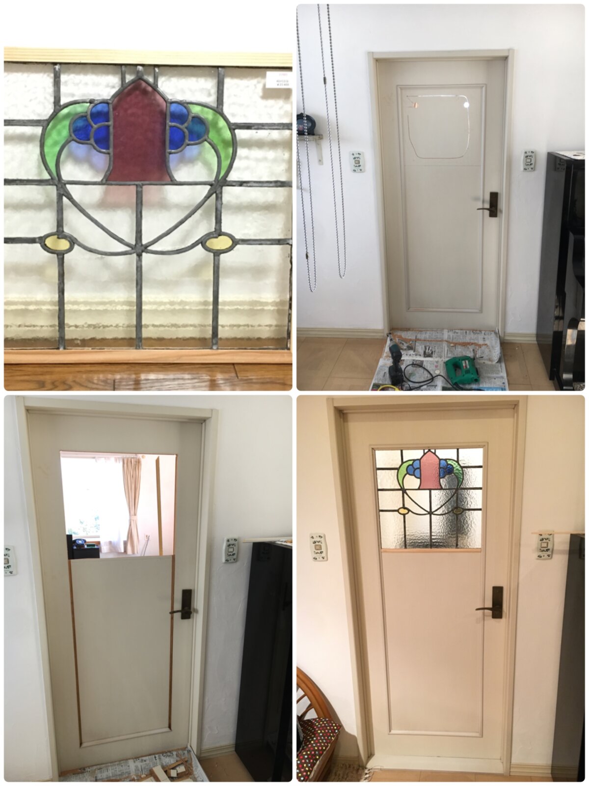アンティークの木枠をそのまま活かして。取り付け、ドアの塗装まですべて、お客様ご自身がDIYで制作されました。お部屋の灯りが、ゆらゆらとガラスに映ってとても綺麗です。