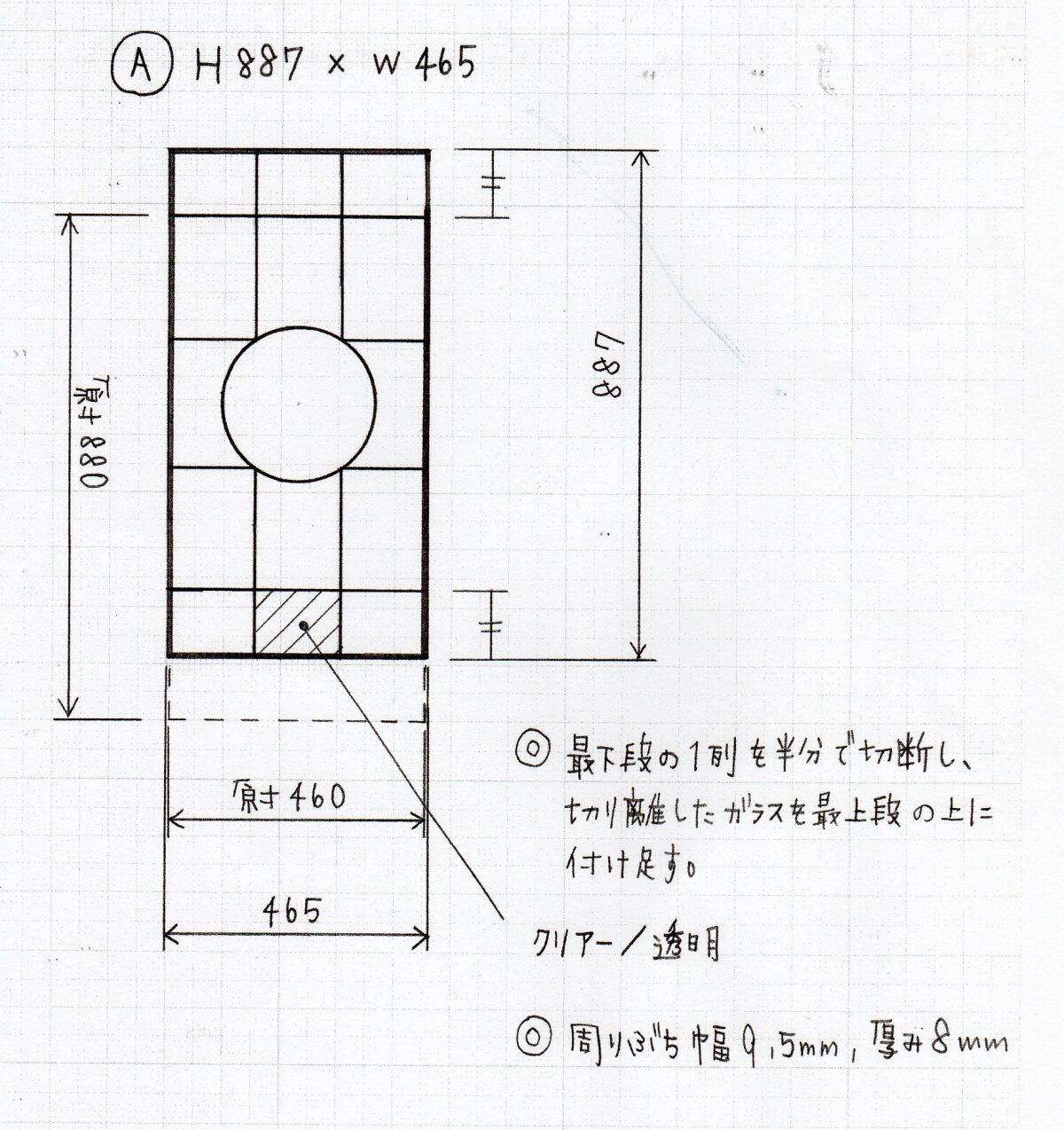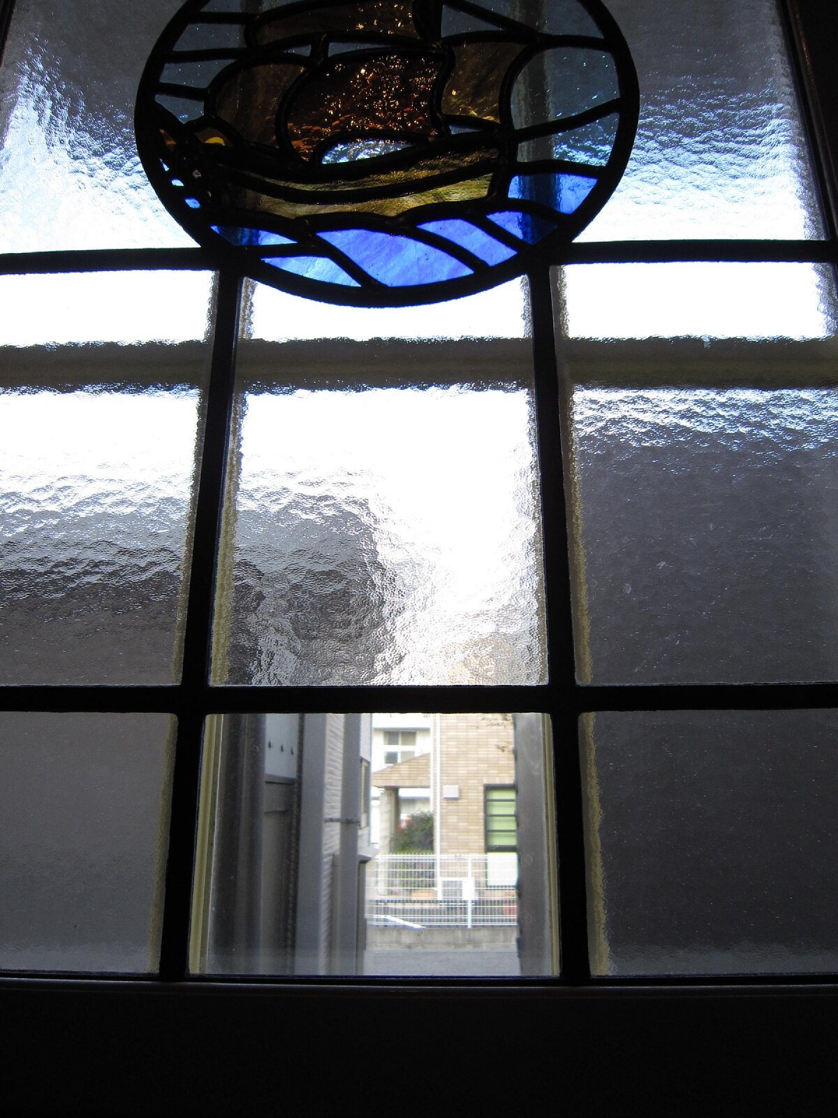 絵柄が中央にくるよう、元のステンドグラスの最下段の1列を半分カットし、切り離したガラスを最上段の上に足しました。最下段の中央のガラスは、外の様子が見えるように、透明ガラスに入れ替えています。加工デザインです。