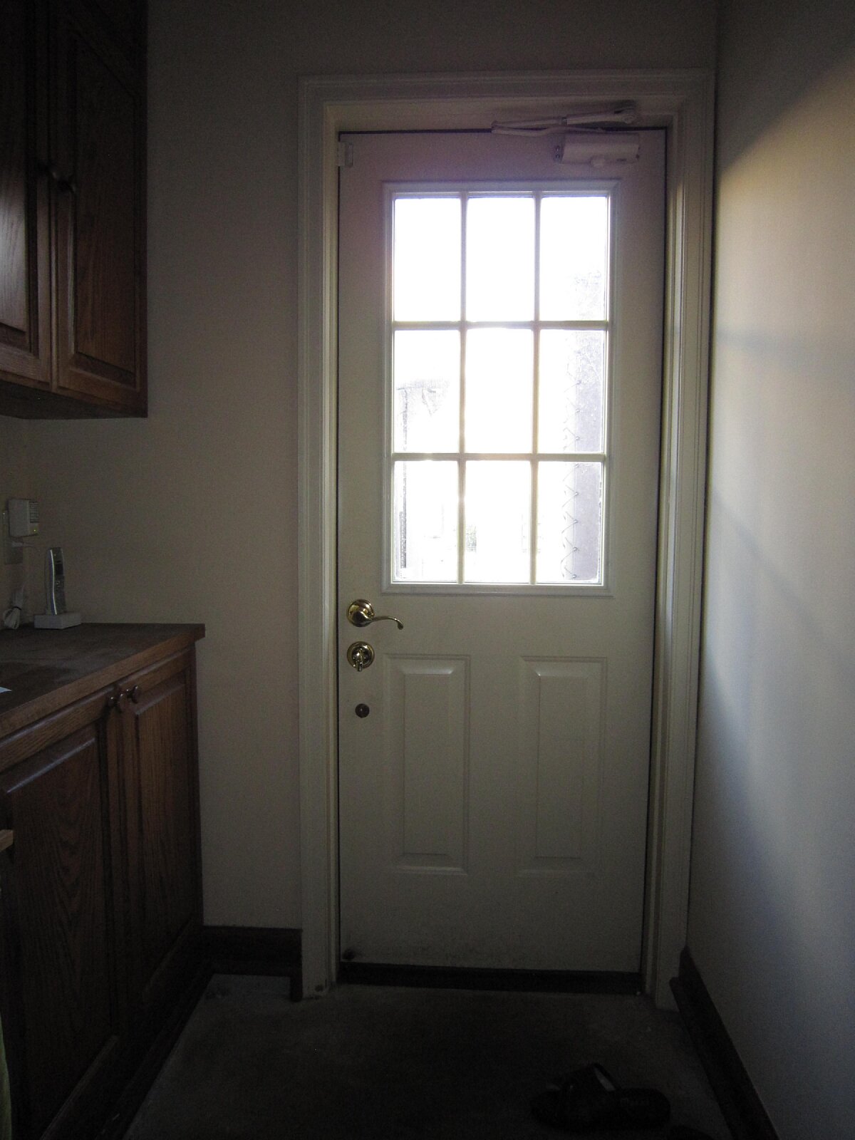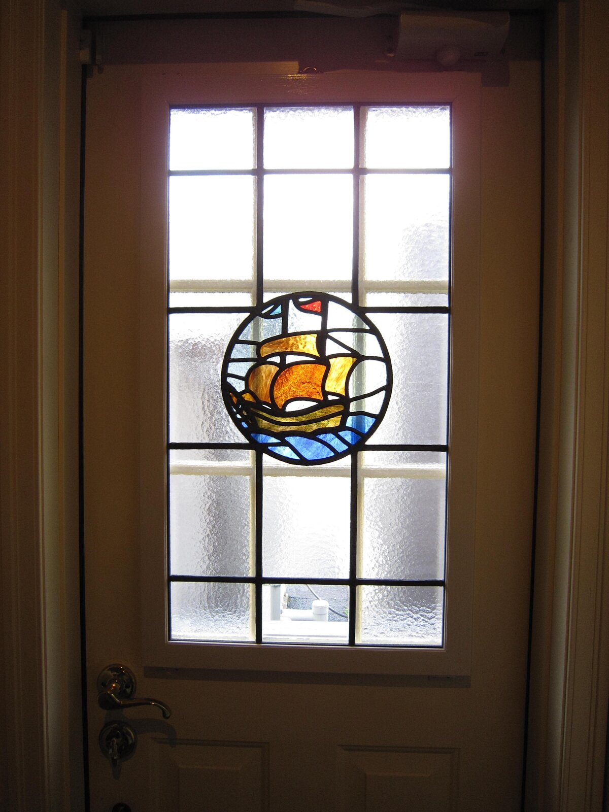 今回は裏口のドアにステンドグラスを取り付けてみました。ドアは初めての挑戦です。窓の桟が透けて見えてうるさくならないように、桟と桟の間の幅と同じ幅のステンドグラスを探していましたが、幅が15cm程度のものは意外に少ないことをこの度初めて知りました。そしてようやく今回のステンドグラスに巡り会えたのです。下段中央の透明ガラスからは外の様子が窺えます。