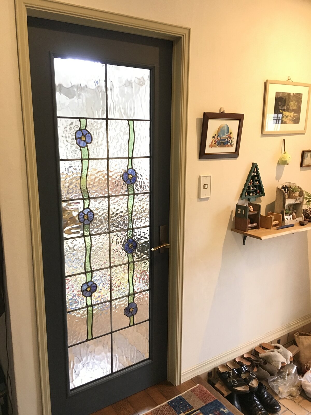 施工はお客様ご自身で、DIYで既存のドアに取り付けをされました。取り付けはご主人が、ドアの塗装は奥様が担当。以前にも、当店でご購入いただいたステンドグラスを、DIYでお部屋のドアに取り付けてくだっています。