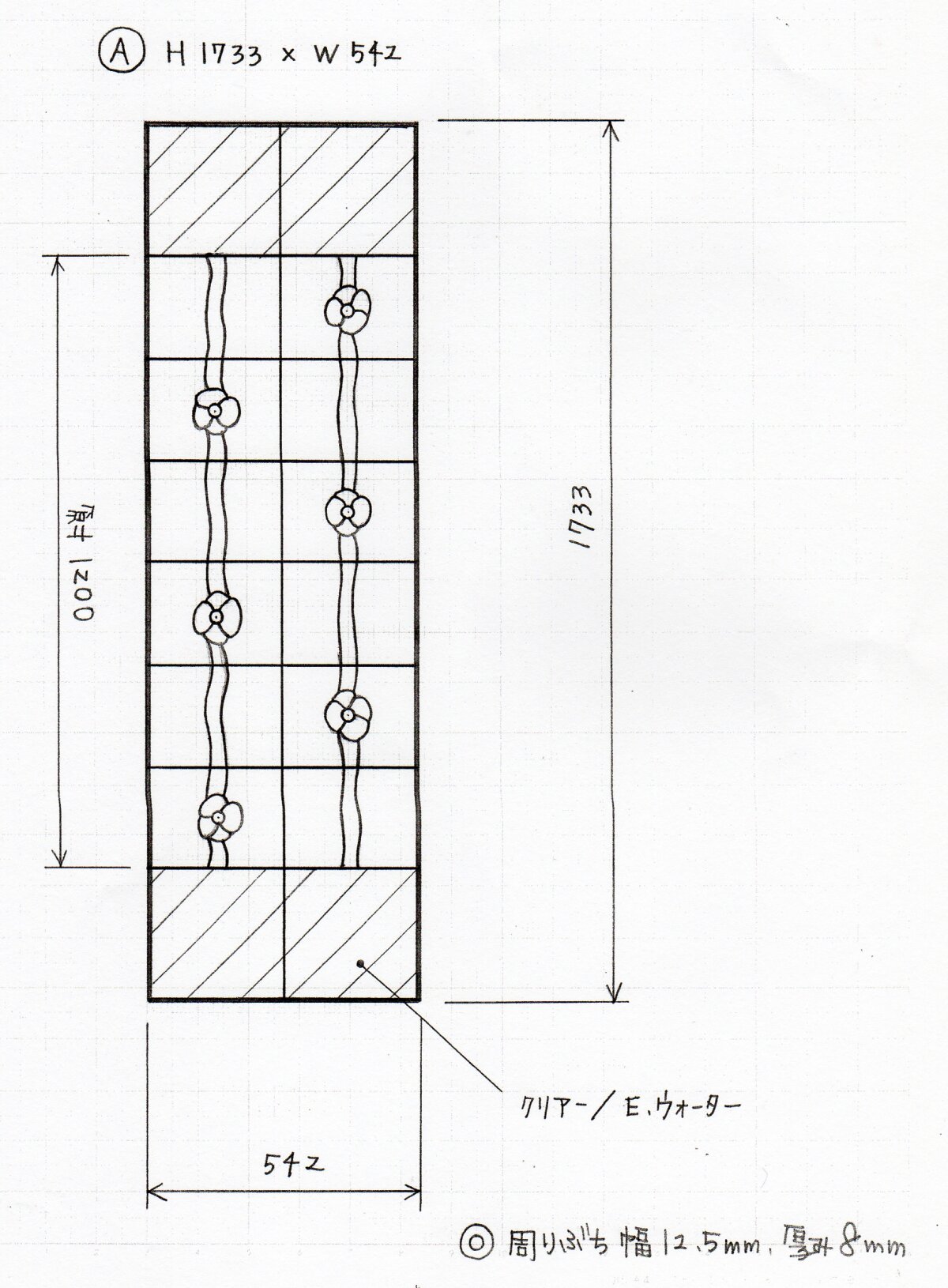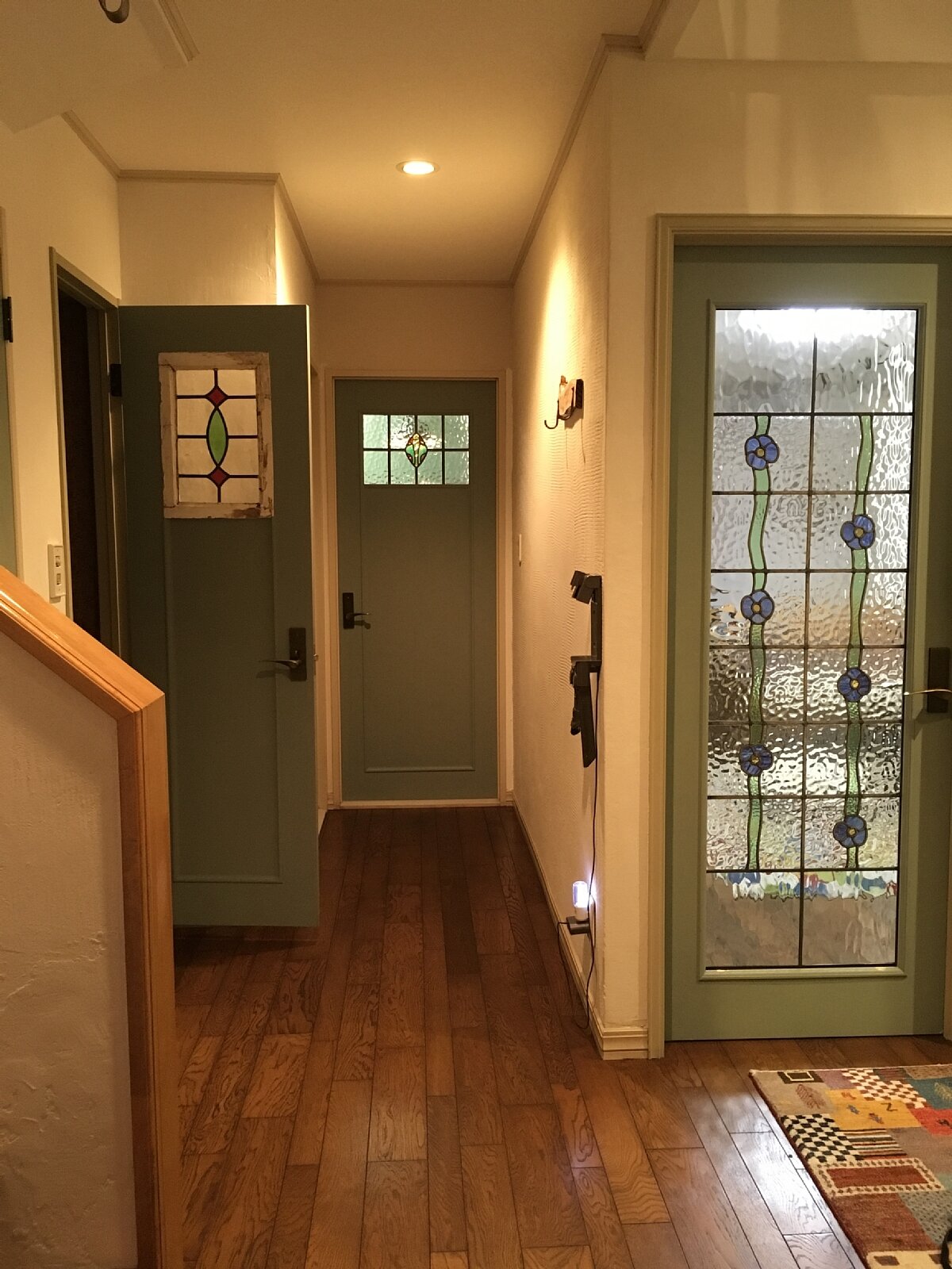 既存のドアの開口部に合わせて、元のステンドグラスの上下にガラスを足しました。加工デザインです。