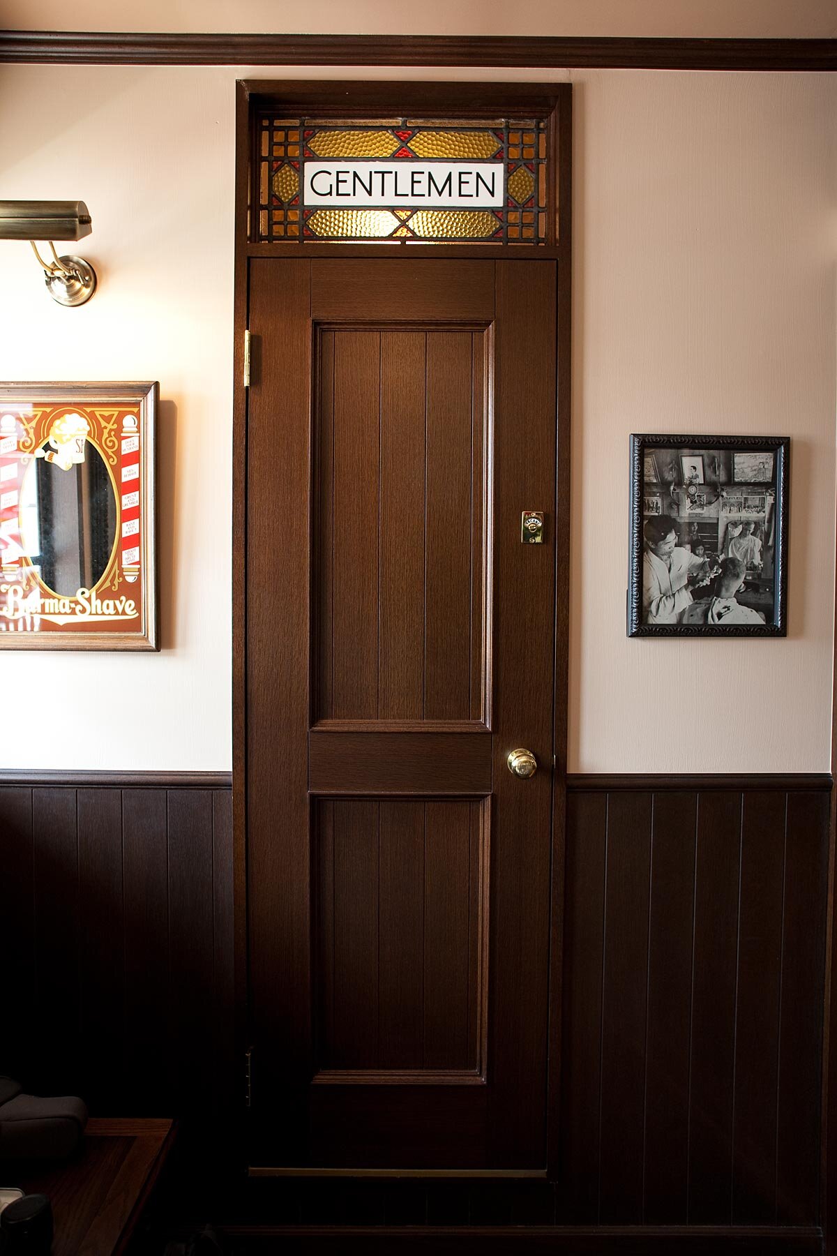 世田谷区にある理髪店 BARRIQUANDです。元のアンティークステンドグラスです。理髪店のトイレドア上部、欄間部分に取り付けました。