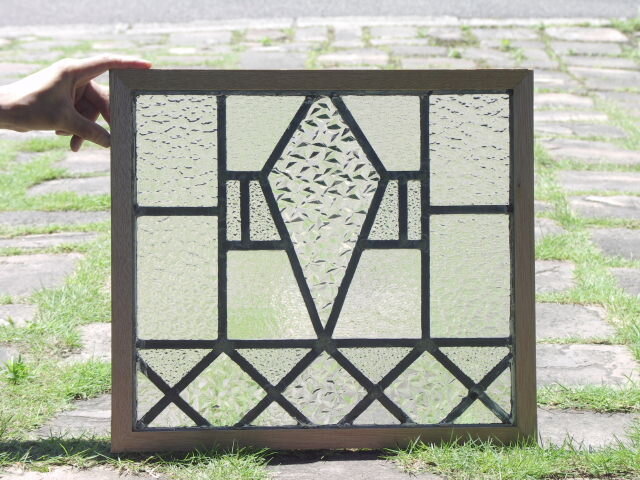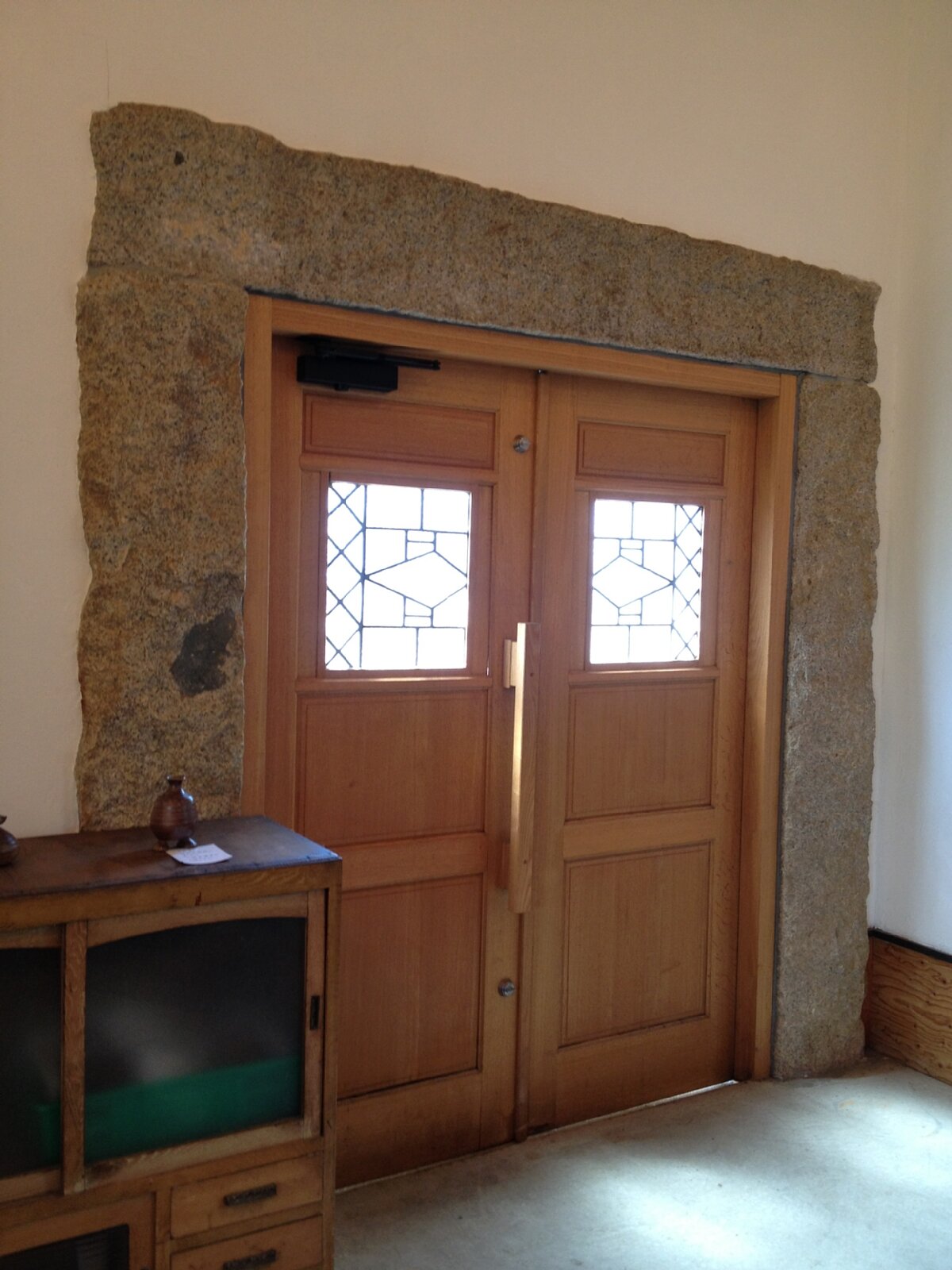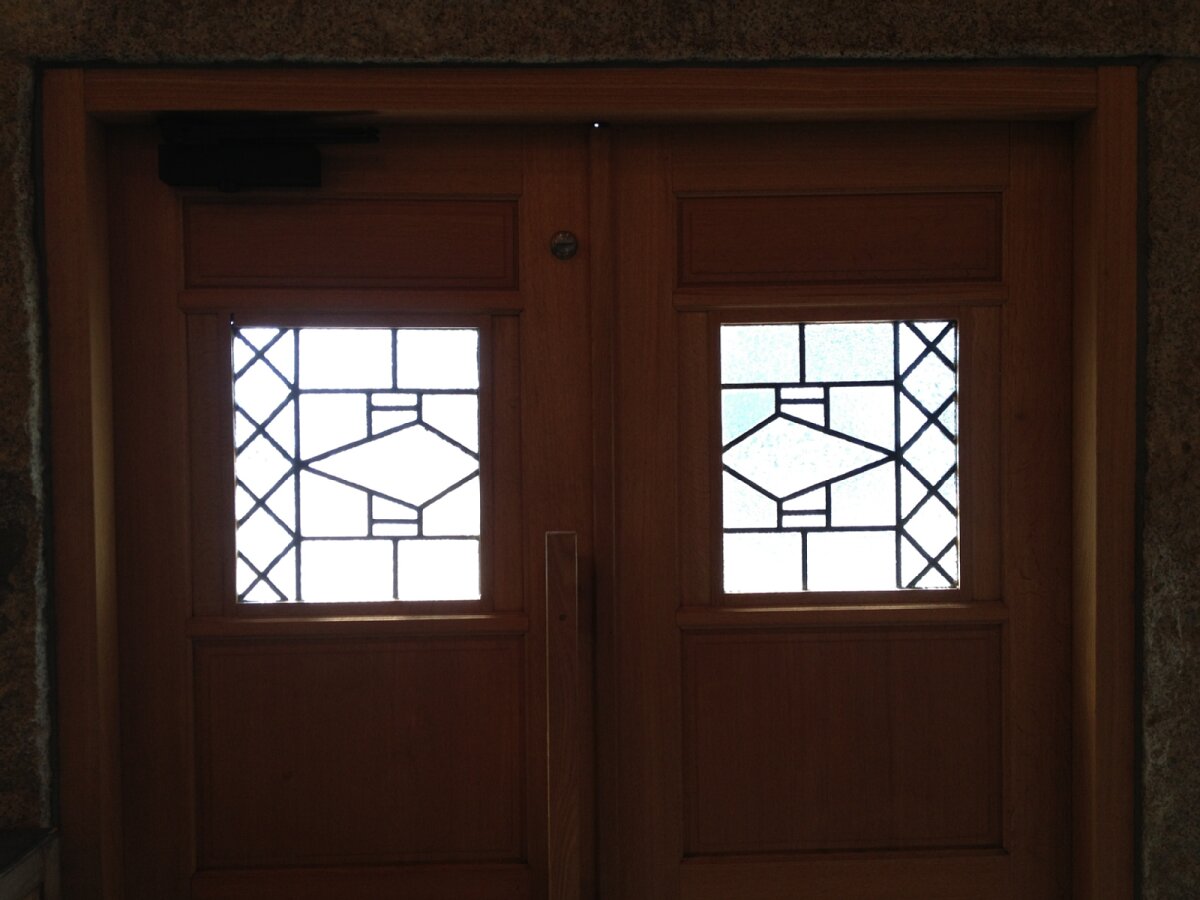 観音開きのドアにはめ込みました。石と木の重厚な雰囲気に無色のステンドグラスがしっくりと馴染んでいます。