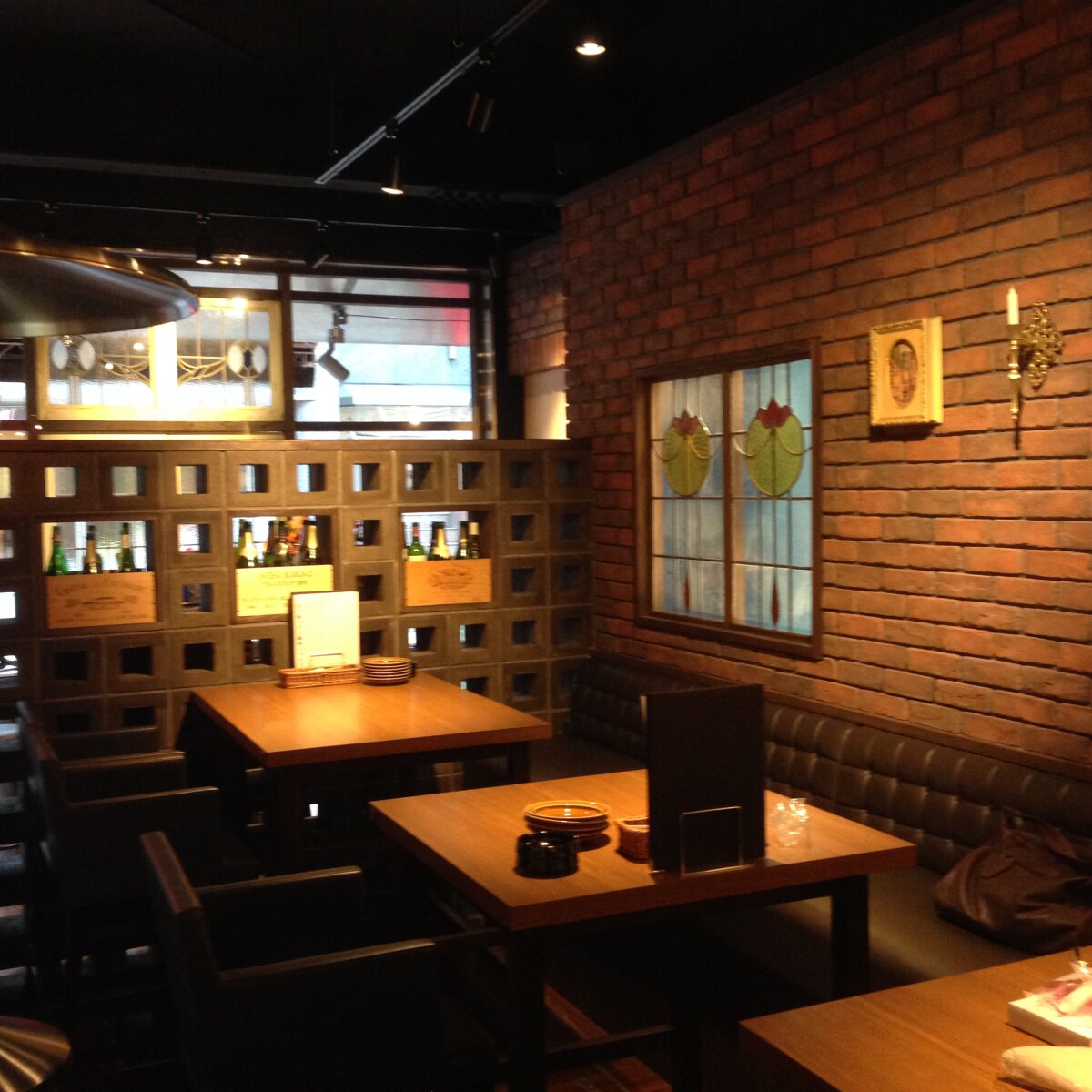 煉瓦の壁に、ステンドグラスのやさしい色合いが良く映えます。あたたかな雰囲気で、女性の方にもお勧めのお店です。