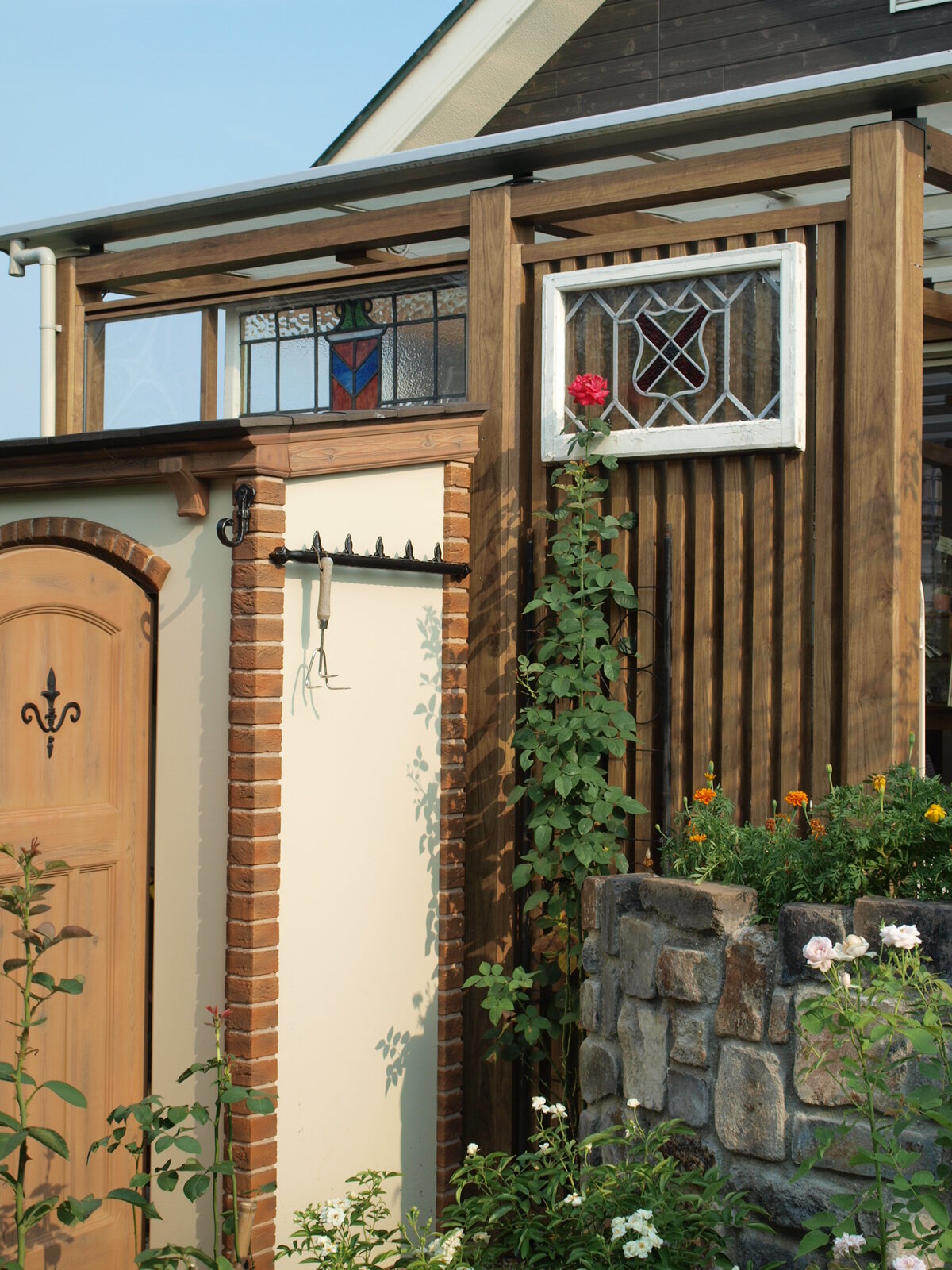 アンティークの木枠の味わいをそのままに活かして、ぬくもりのある雰囲気に。敷地内の広大なガーデンは、モルタル造形のデザイン壁や門柱で美しく演出され、フレッシュハーブティーとして楽しめるハーブが約90種類植えられています。