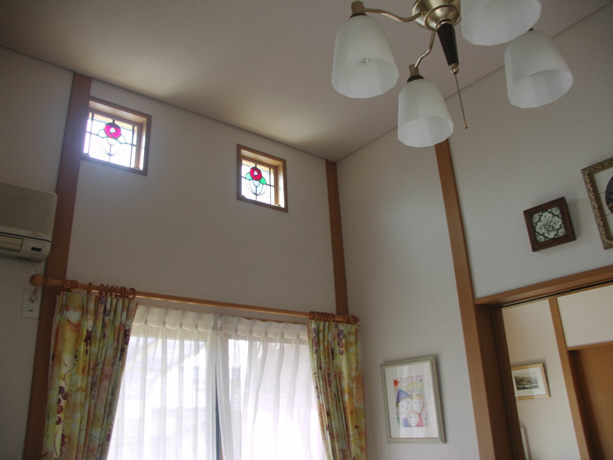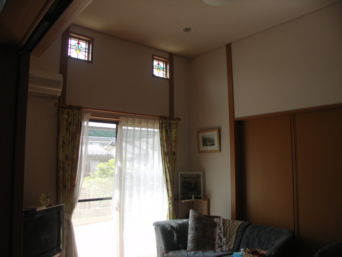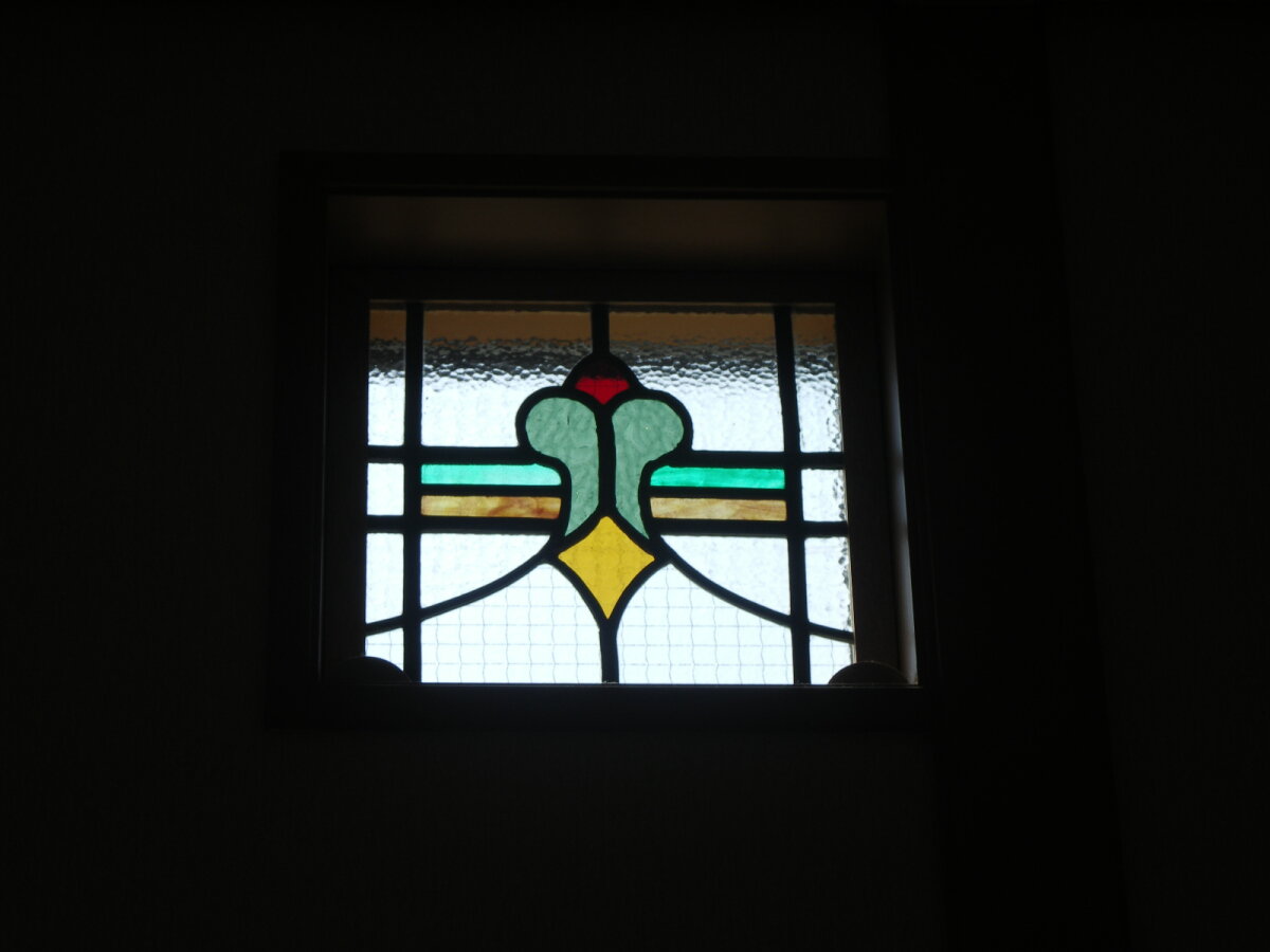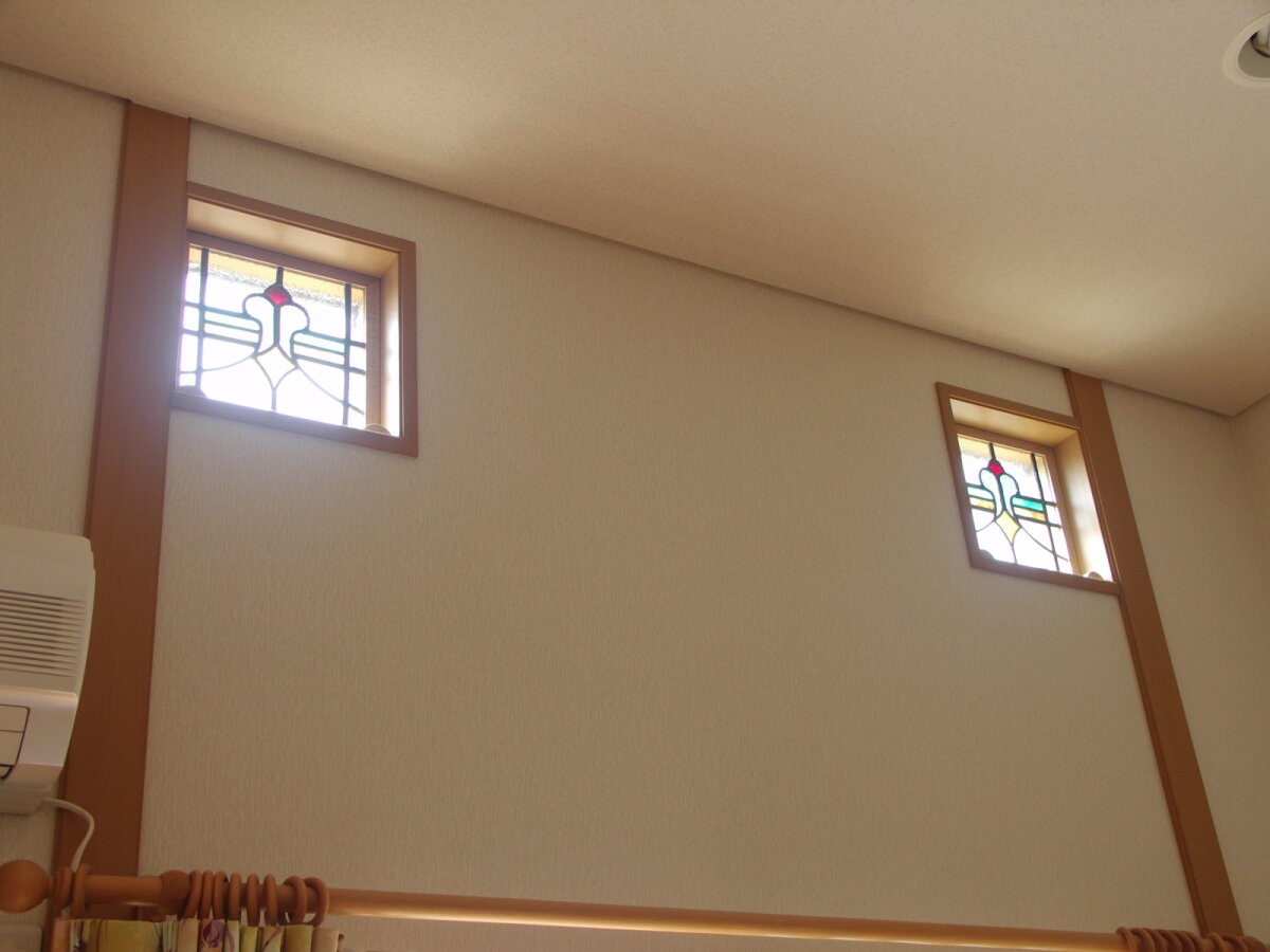 FIX窓の内側にステンドグラスを重ねて固定しました。同じ窓の配置でも模様の違うステンドグラスを取り付けるとお部屋ごとに雰囲気が変わります。