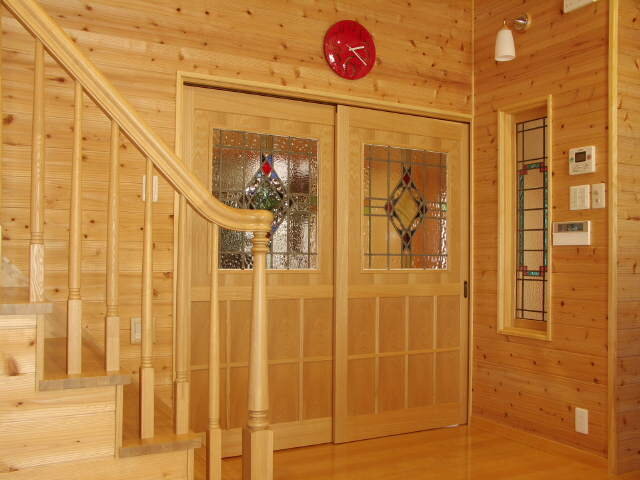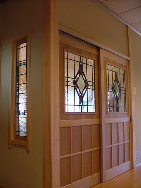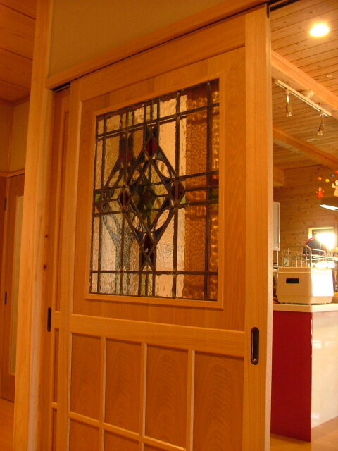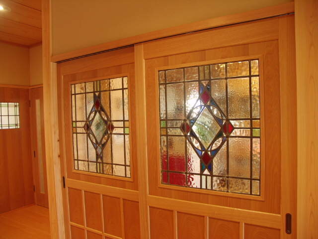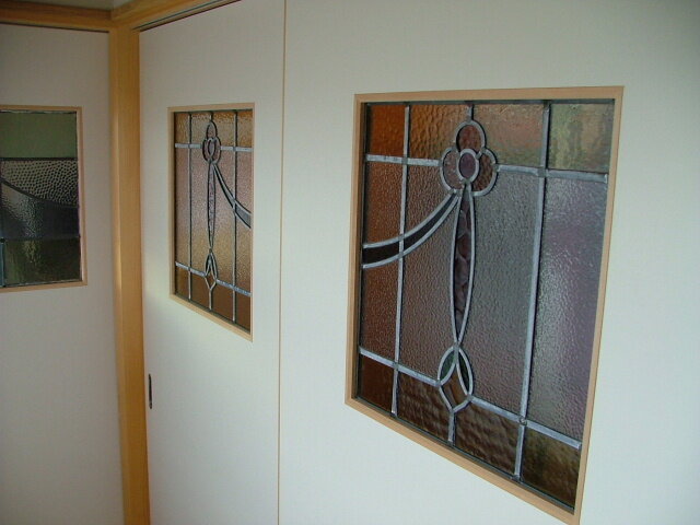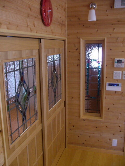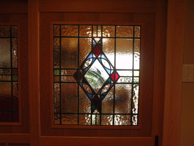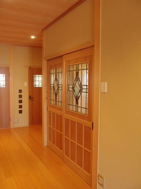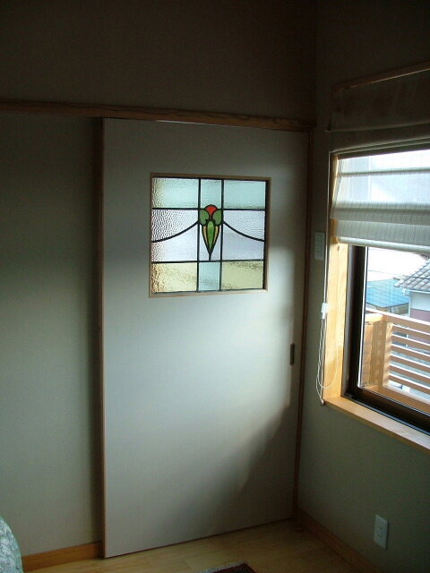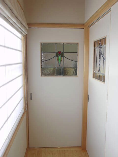 引き戸にも2枚揃いのステンドグラスを。廊下側からの様子です。