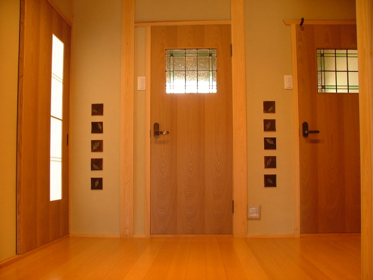 新築の家の各所にステンドグラスを取り付けました。まずは1階から。隣り合うドアに同じ模様のステンドグラスを取り付けました。
