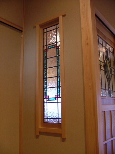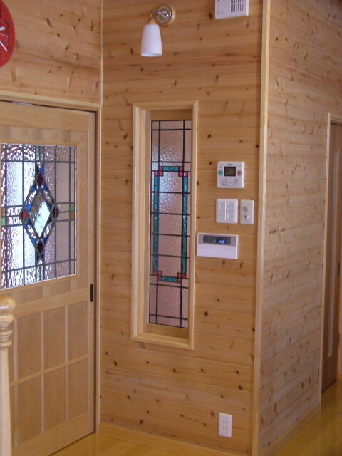 引き戸の隣の壁にも 色味を合わせた縦長のステンドグラスが納められています。