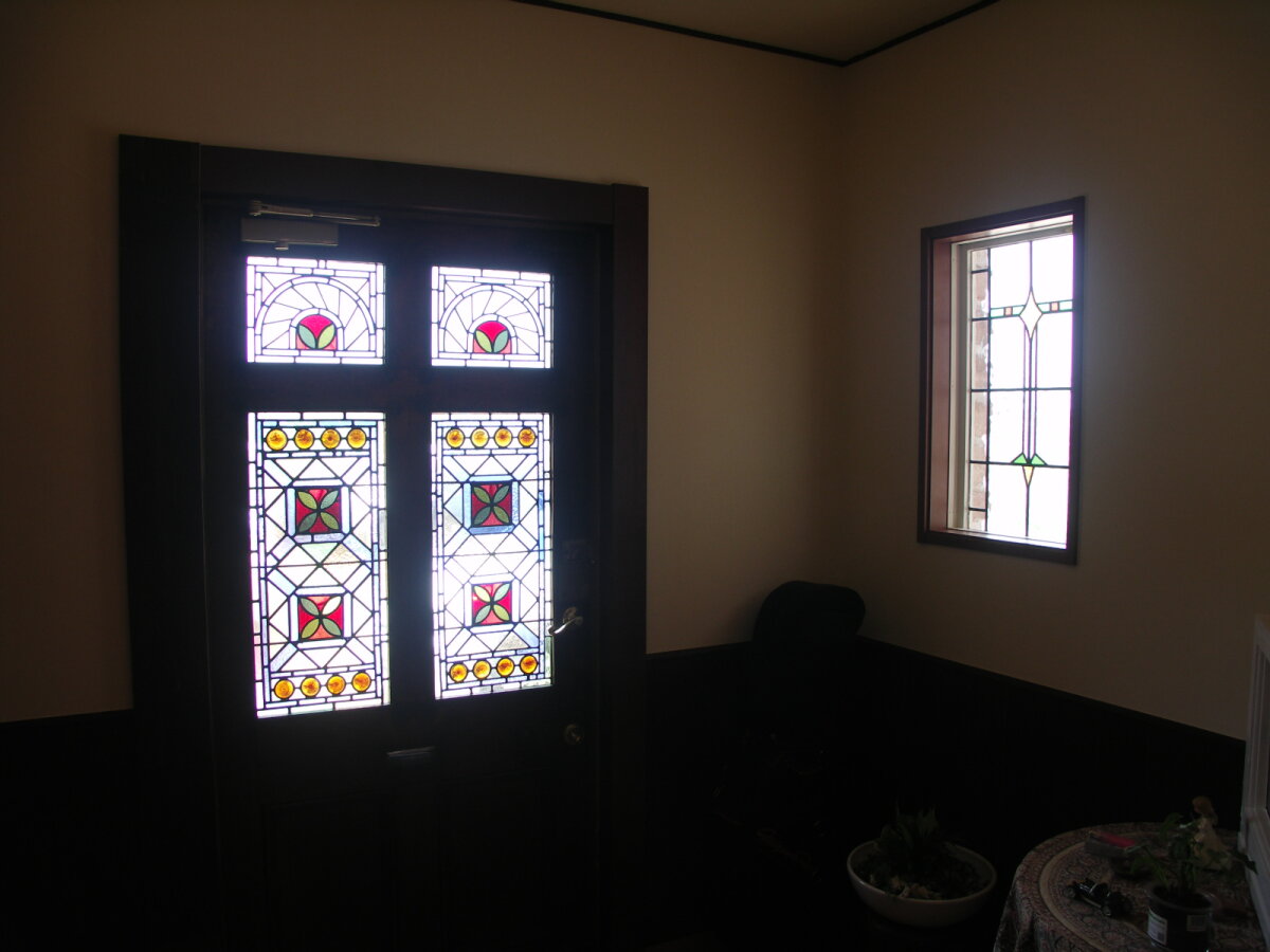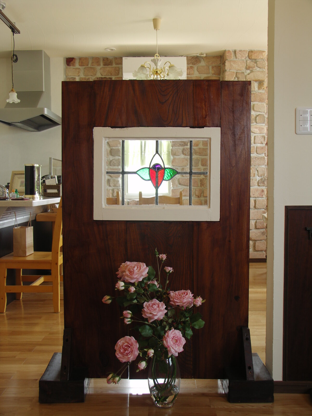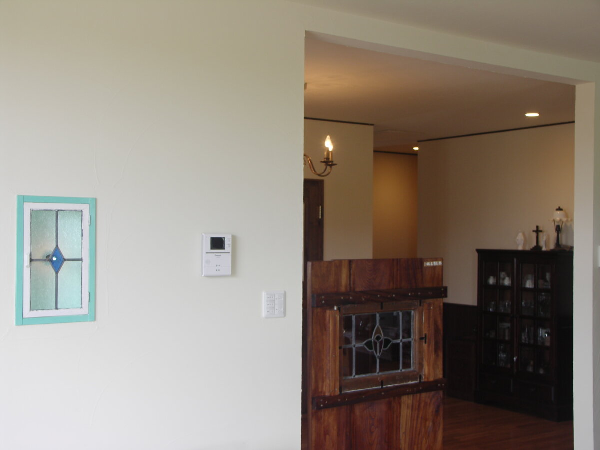 玄関側から見た室内の様子です。左側と正面のドアにはバラ模様のステンドグラス。右側のキッチンとリビングの間にはステンド入りの衝立があります。
