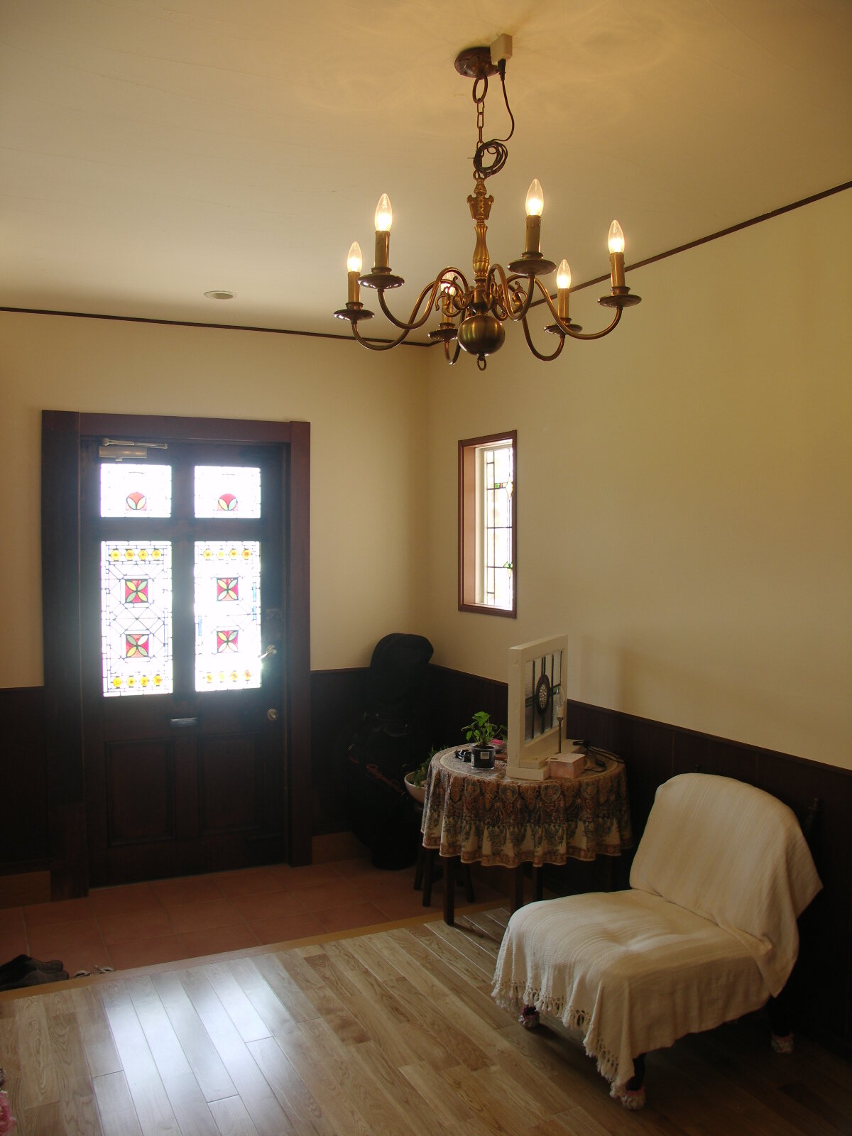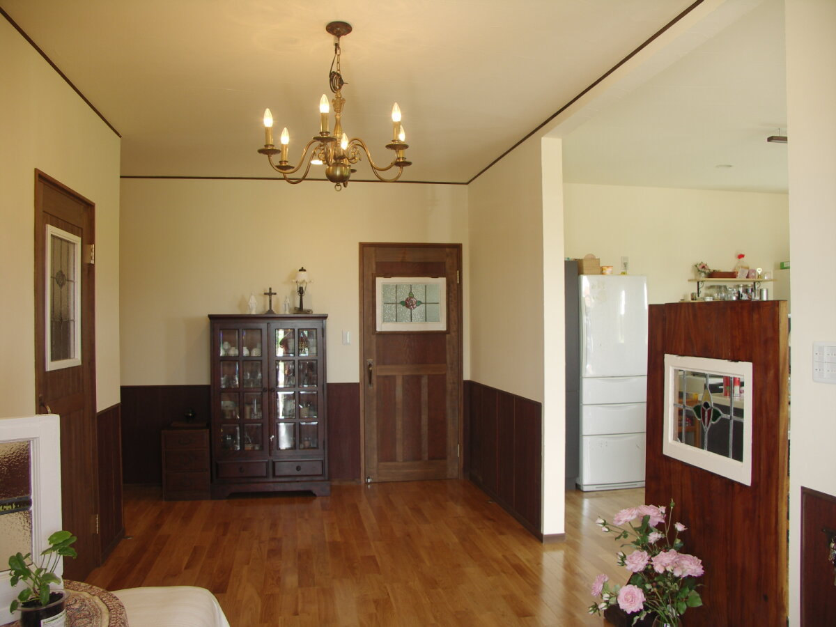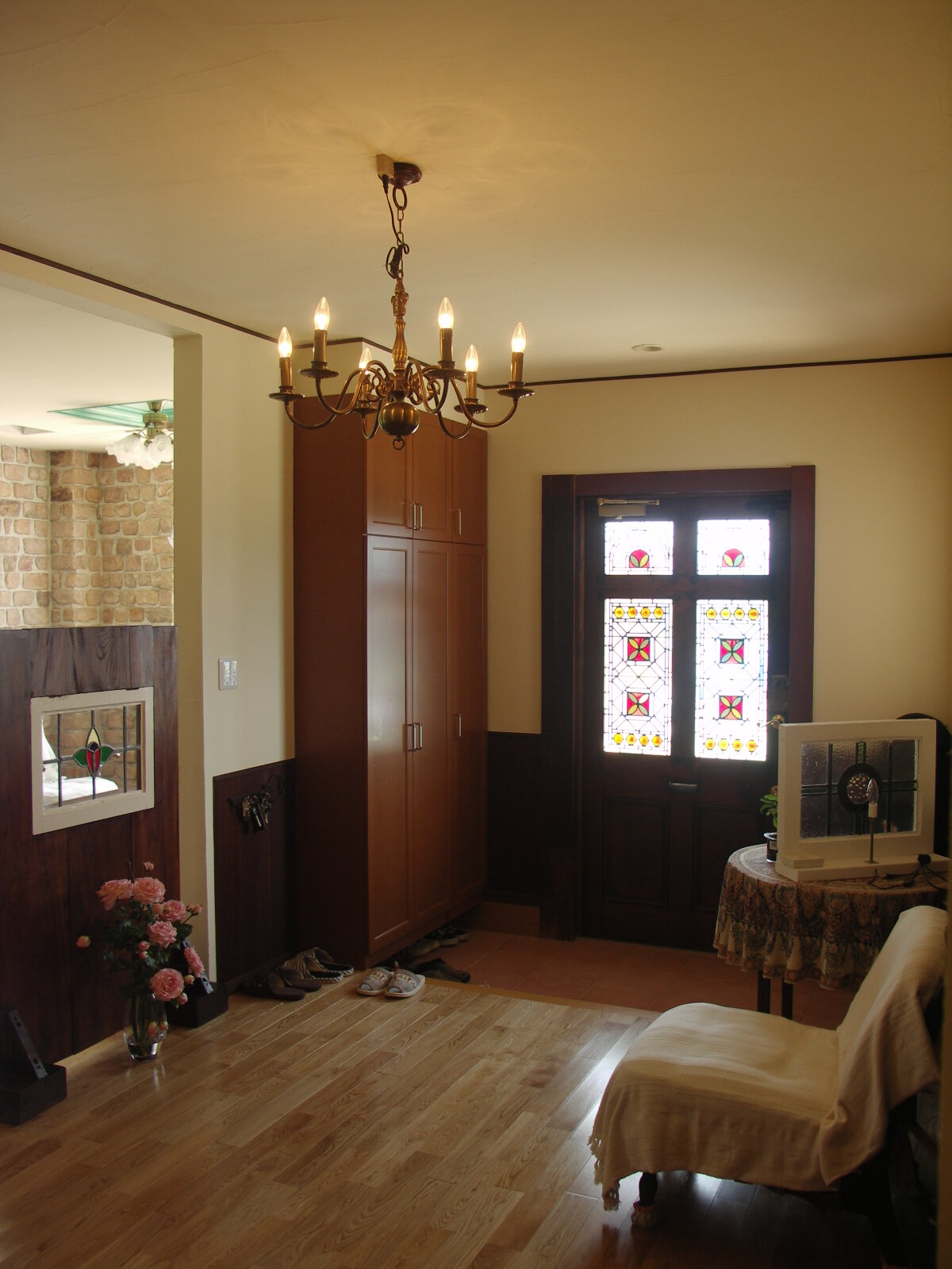 玄関側から見た室内の様子です。左側と正面のドアにはバラ模様のステンドグラス。右側のキッチンとリビングの間にはステンド入りの衝立があります。