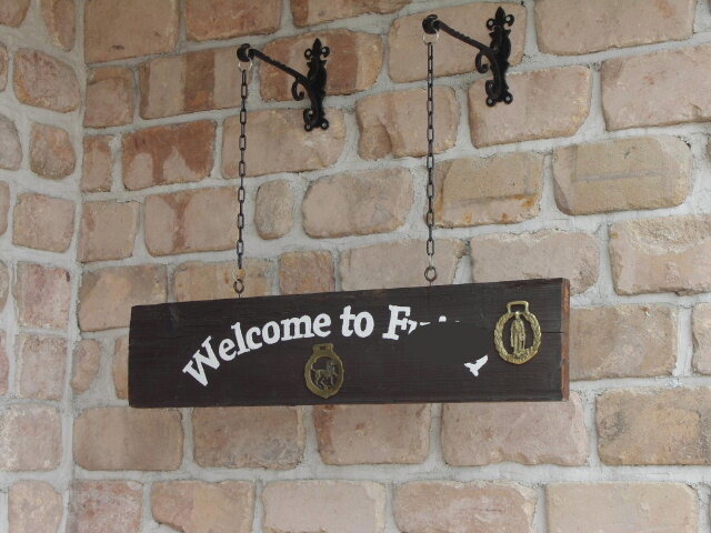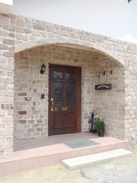 玄関のアンティークステンドドアは重厚感とあたたかみのある魅力的な佇まい。ホースブラスが目を引く表札はご主人のお手製!ホースブラスは馬具の装飾品で、イギリスでは幸運をもたらすアイテムとしても古くから親しまれているんですよ。