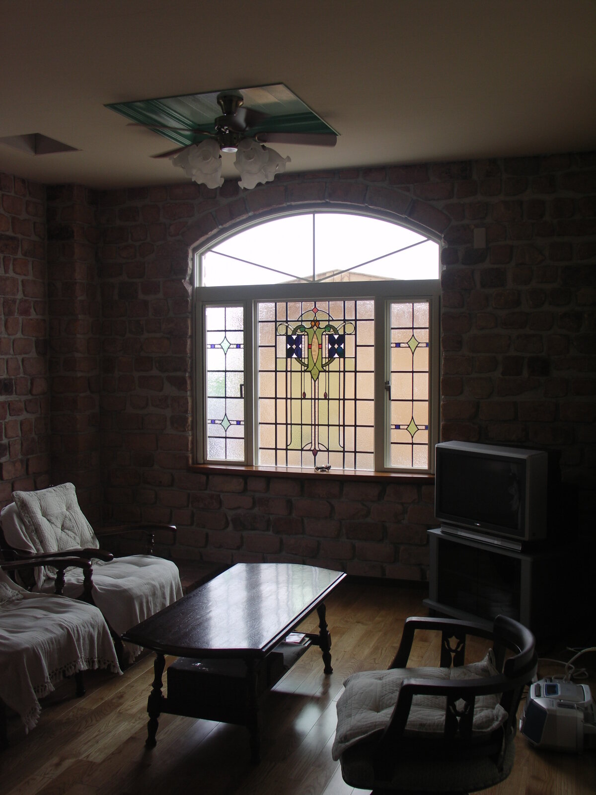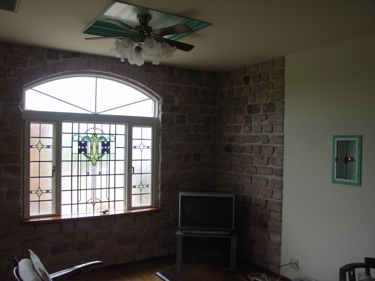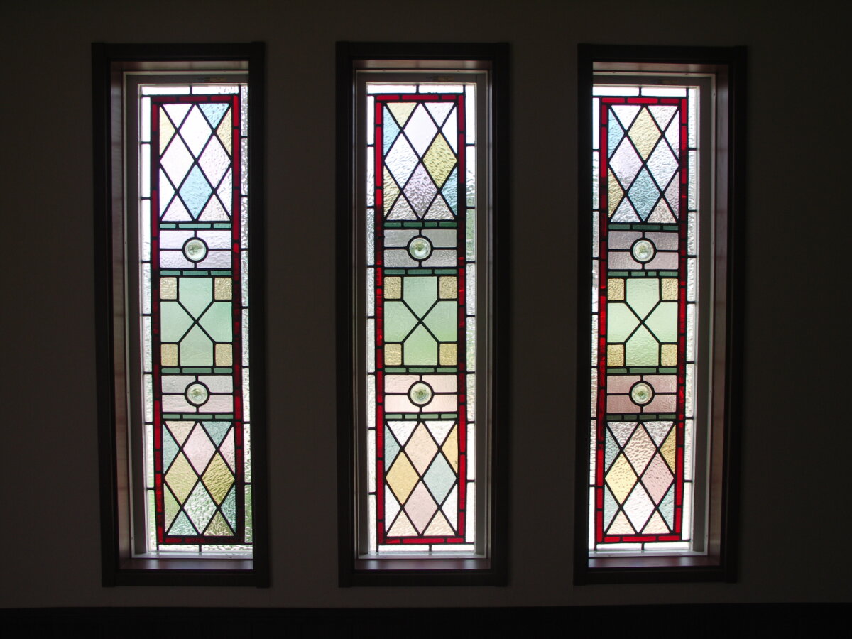 リビングの窓はサッシ枠で、取り付け可能なガラスのサイズが決まっていたため、当店にてステンドグラスのサイズを加工調整しました。中央の窓ははめ殺し、両サイドは開閉可能な窓になっています。