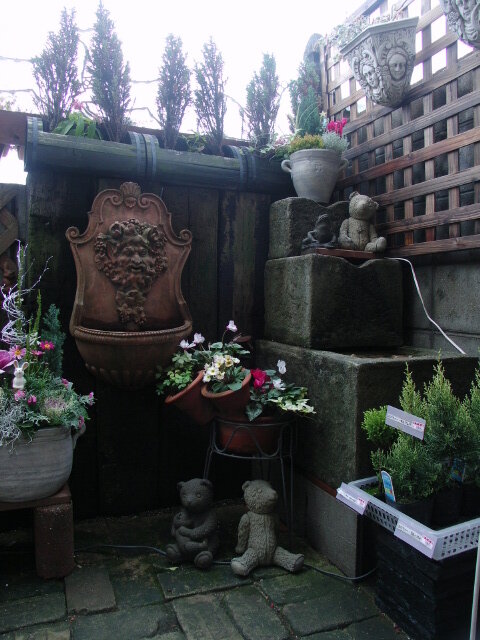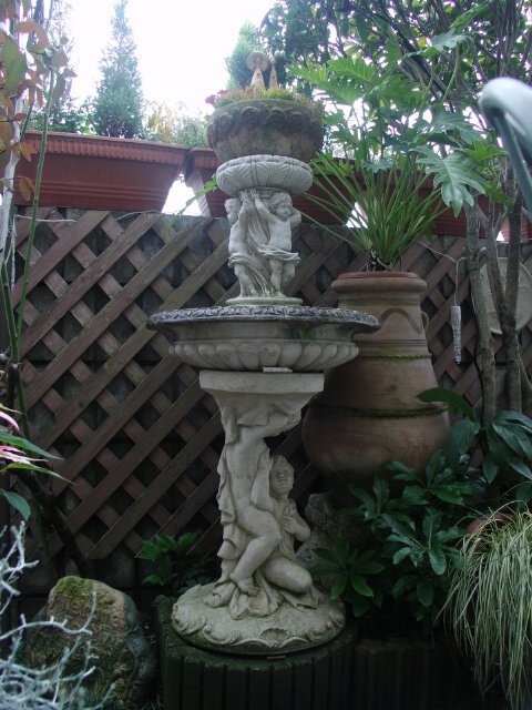 裏庭は壁泉やバードバスを配し、しっとりと落ち着いた印象に。