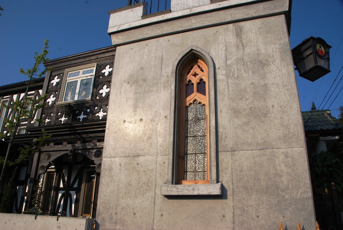 以前にもご紹介させていただいたB邸。ご自身の設計にて完成したゲートのアーチ窓に、ステンドグラスをはめ込みました。