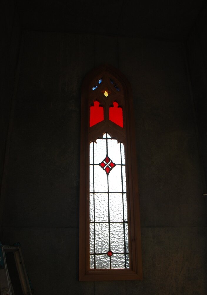 サッシ窓の内側に木を渡しステンドグラスを固定しました。