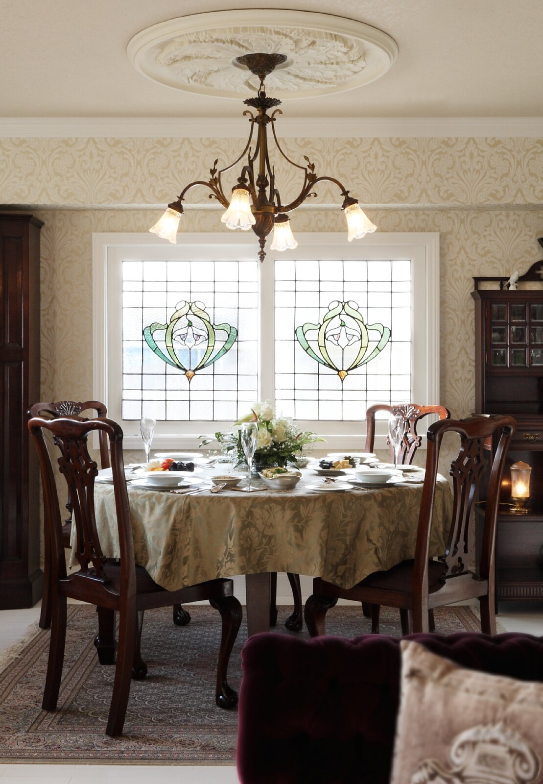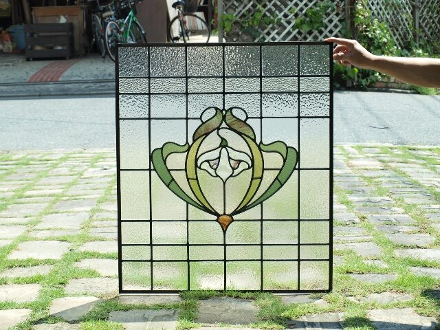 神奈川県のY邸です。マンションのリフォームでご希望のサイズに加工したステンドグラスをお部屋の窓に取り付けました。元のアンティークステンドグラスです。