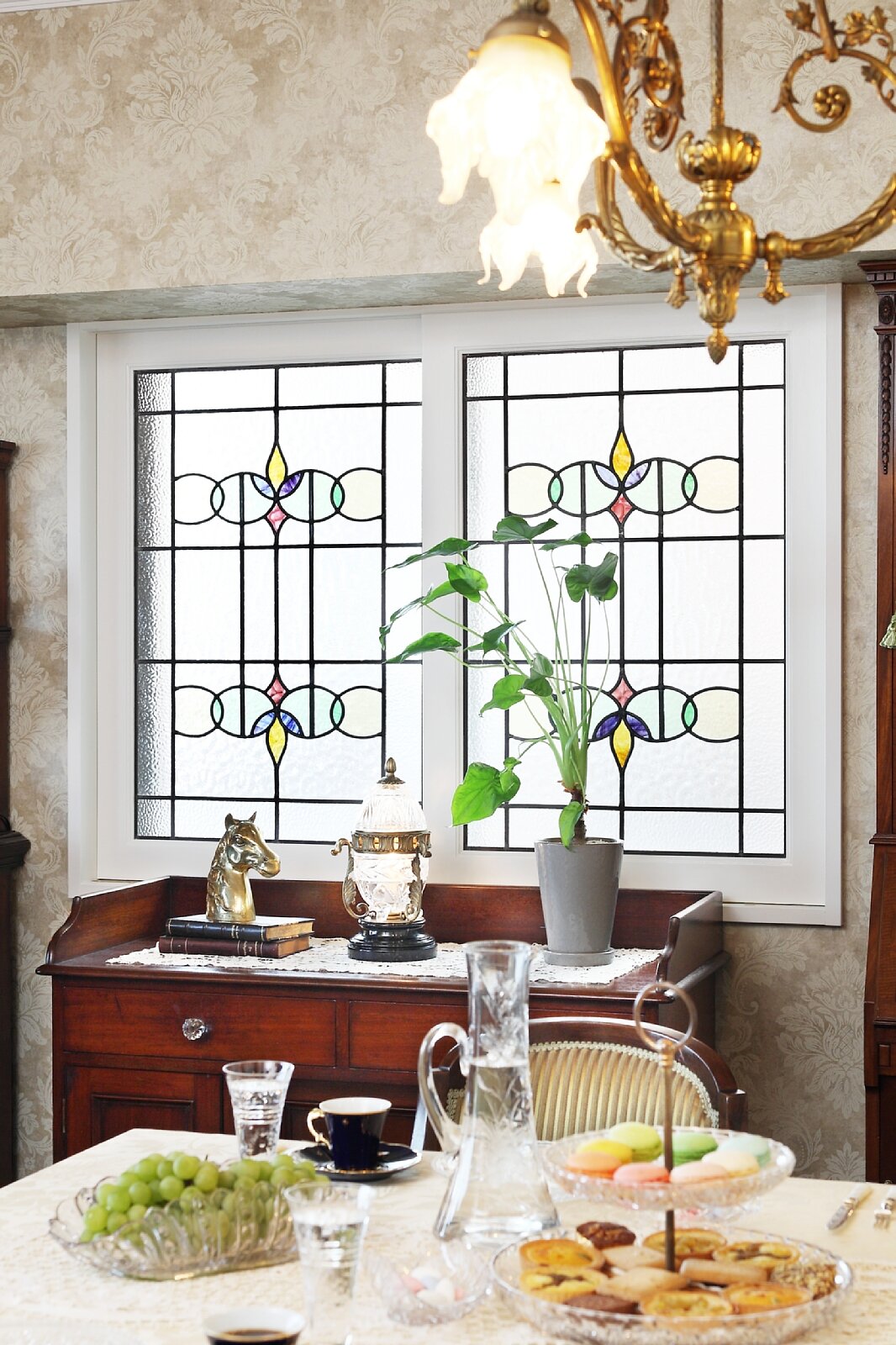 東京都のさちみりほ様邸です。マンションのリフォームでご希望のサイズに加工したステンドグラスをお部屋の窓に取り付けました。元のアンティークステンドグラスです。
