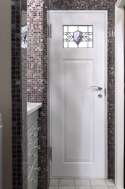 東京都のY邸です。マンションのリフォームでご希望のサイズに加工したステンドグラスをお部屋のドアに取り付けました。元のアンティークステンドグラスです。