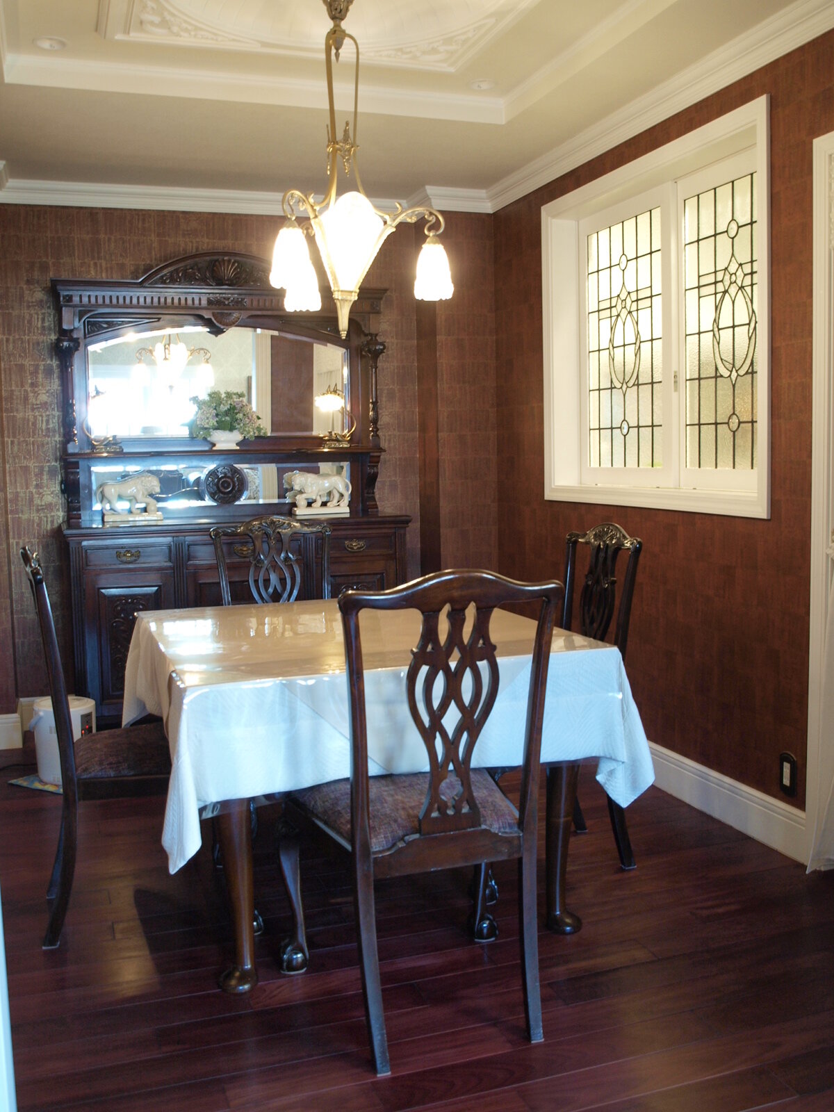 キッチンカウンターに、ダイニングからの目隠しも兼ねて取り付けました。窓は開閉できるようになっていて、来客時や食事の際には、ダイニングを美しく居心地の良い雰囲気にしてくれます。