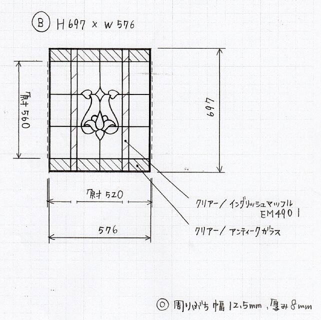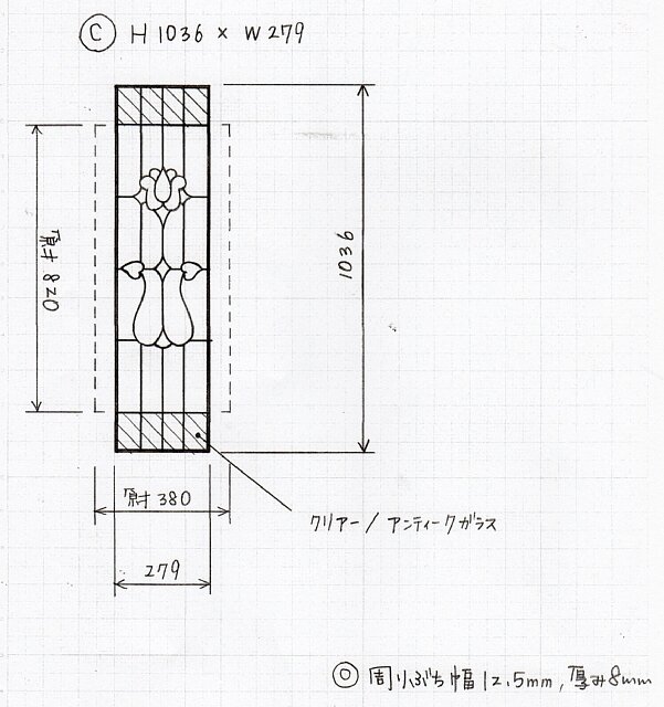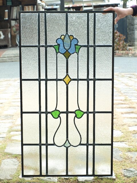 2枚の同柄のステンドグラスを上下対称につなぎました。