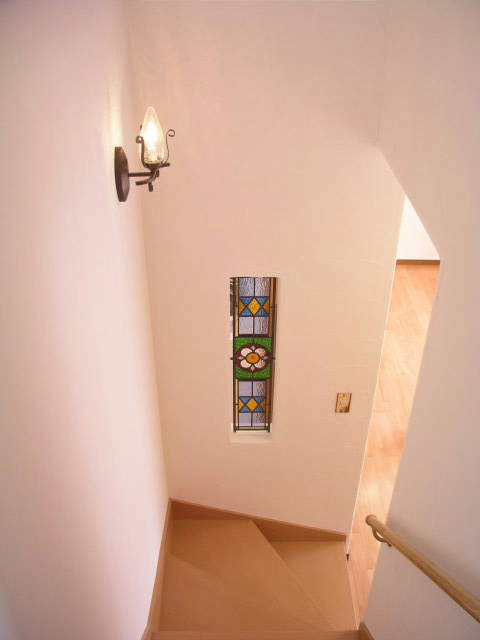 階段からも縦長のステンドグラスをみることが出来ます。