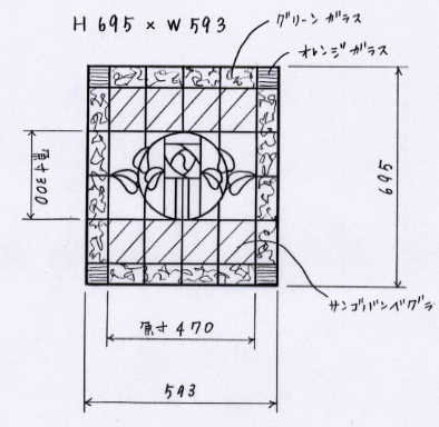 加工デザインです。 元のステンドグラスの周りに色ガラスを足しました。 ≪見積もり≫ ステンドグラス ¥28,200 加工賃 ¥33,000 材料代 ¥12,000 ------------------------------ 合計 ¥73,200