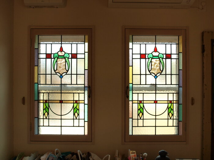 お家の中、外に、ステンドグラスが工夫して取り付けられています。