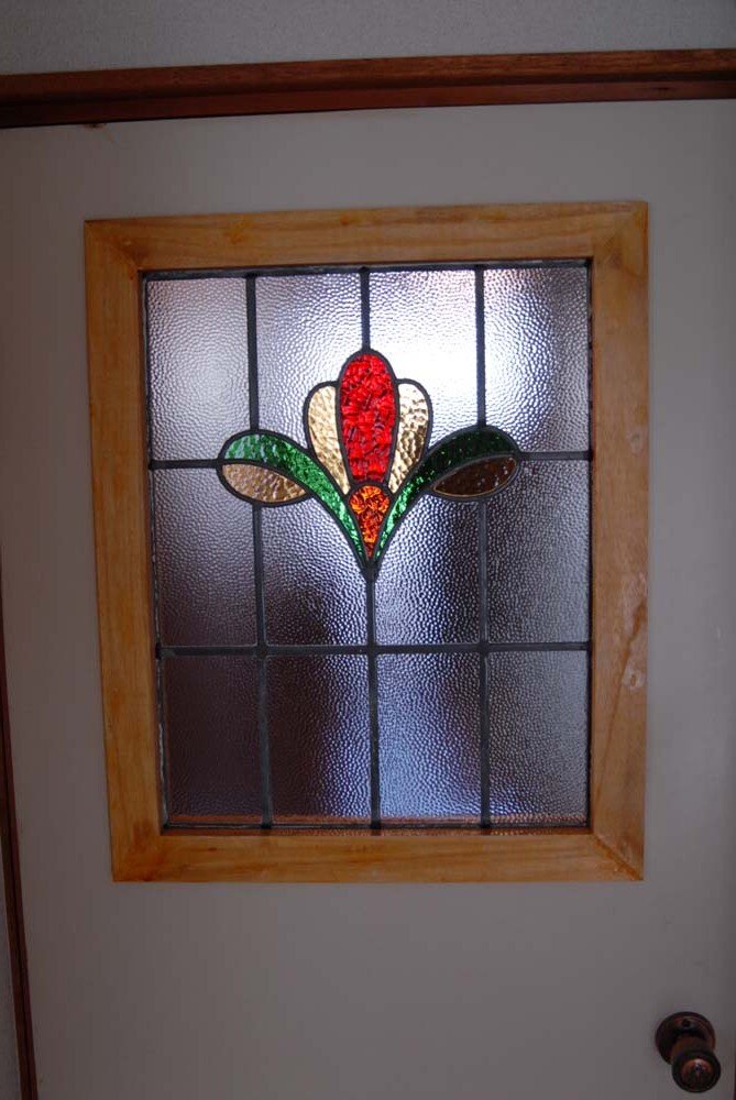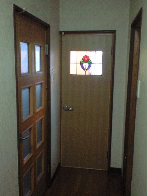 小さく加工したステンドグラスを隣り合うドアに取り付けました。